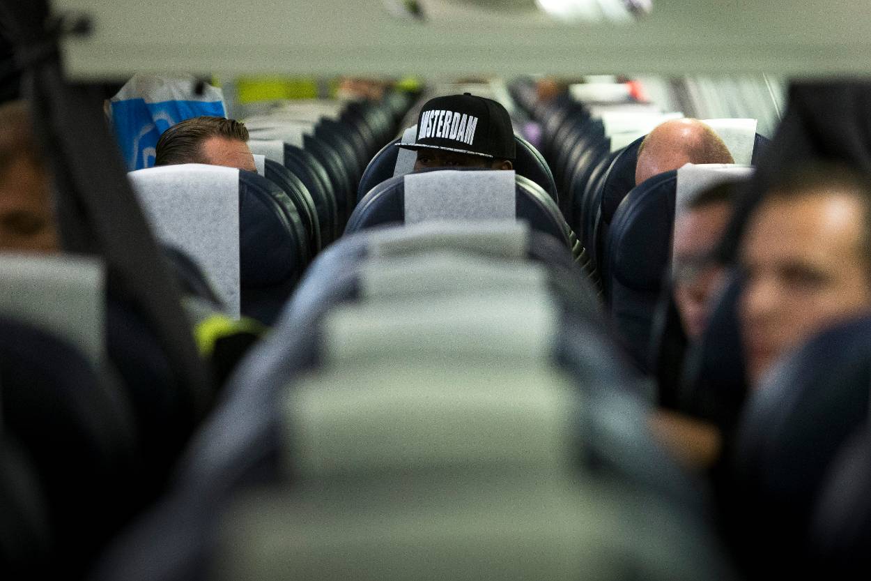 Een zwart petje met ‘Amsterdam’ steekt iets boven de vliegtuigstoelen uit. De donkere ogen daaronder nemen de omgeving op. Zowel links als rechts een lange, blanke jongeman. Zittend tussen marechaussee-begeleiders. Escorte, vreemdeling, escorte, zo is de stoelverdeling op deze uitzettingsvlucht naar Nigeria. Geen militaire of politietenues. Nette pantalons, overhemden en colbertjes, dat is de dress code bij de repatriëring van vreemdelingen.