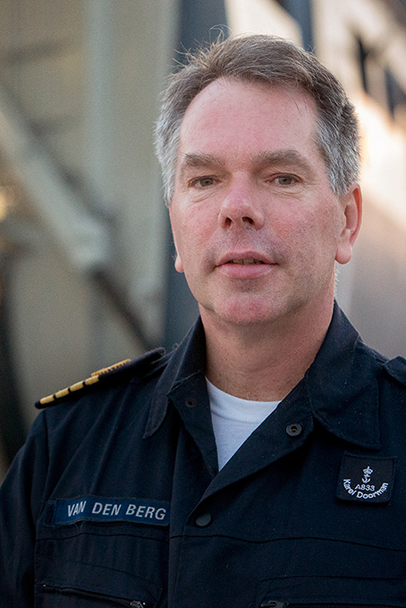 “We gaan hier geen handjes schudden”, aldus commandant kapitein-ter-zee Peter van den Berg op de brug van het schip. Hij kijkt met een schuin oog richting de haven van Freetown als hij vertelt: “We houden ons aan strikte protocollen. Iedereen die van de wal komt, moet zich onder meer laten temperaturen. Niemand uitgezonderd, al wil de president aan boord.” Onderofficieren van de landmacht nemen die taak voor hun rekening. De militair verpleegkundigen zijn speciaal opgeleid om om te gaan met eventuele ebola-besmettingen. Sergeant1 Paul Mus: “Ik zie het als een unieke kans om hier een bijdrage te leveren. Wij zijn 'mission critical' omdat we de gezondheid van de bemanning waarborgen. Het is prachtig om te zien hoe wij in 3 weken een hecht team hebben gevormd met de marine.”