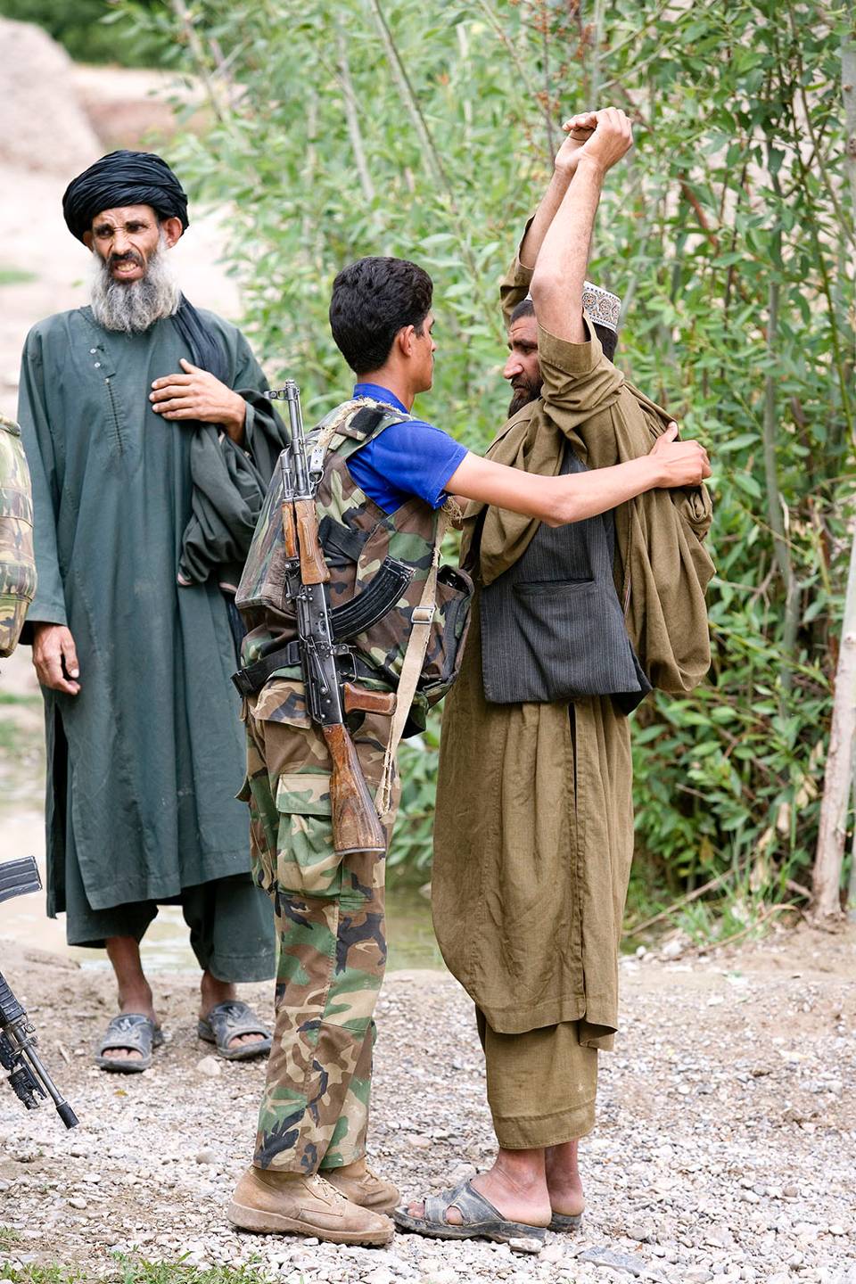 Een Afghaanse militair fouilleert een dorpsbewoner in Karbala. Afghaanse en Nederlandse militairen bezoeken het dorp om de schade vast te stellen van eerdere gevechten.