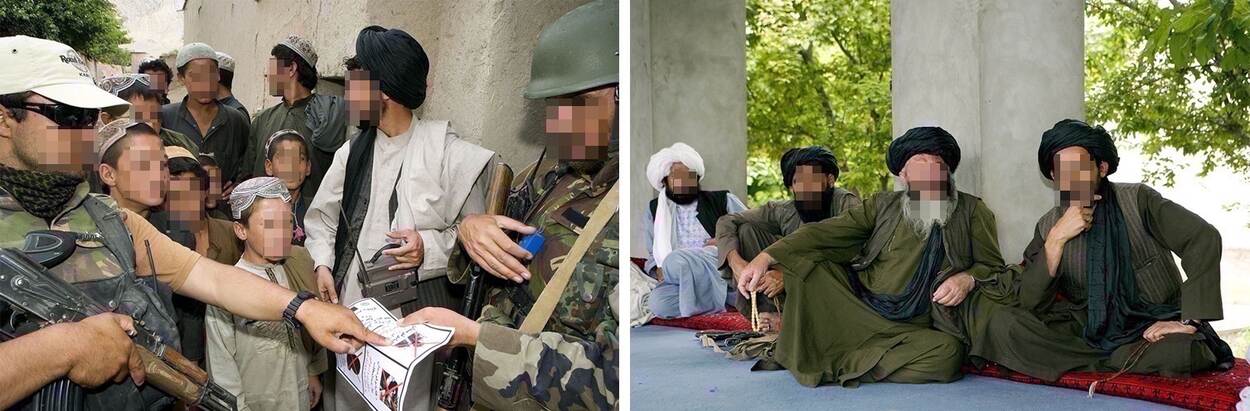 (foto links) Psyops in Uruzgan: Nederlandse en Afghaanse militairen delen pamfletten uit waarop uitgeschakelde Talibanleiders te zien zijn. (foto rechts) Dorpsoudsten in het dorpje Karbala.
