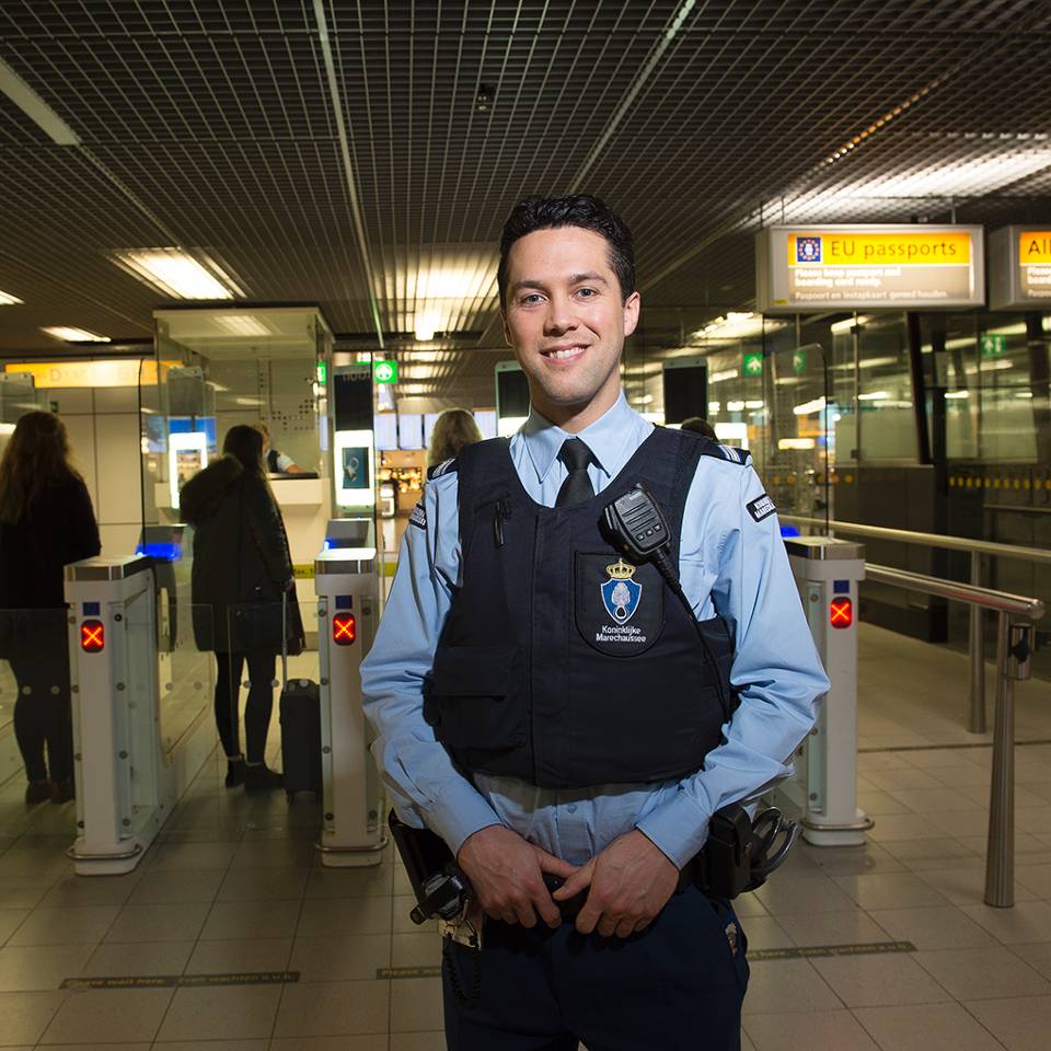 “Het werk van de Koninklijke Marechaussee op Schiphol is veel veelzijdiger dan de mensen vaak denken. We doen meer dan paspoorten controleren. Zelf werk ik nu bij de Brigade Grensbewaking en dat houdt in dat ik controle uitoefen op het personenverkeer. Ons doel is om te voorkomen dat ongewenste vreemdelingen Nederland of 1 van de andere Schengen-landen binnenkomen.