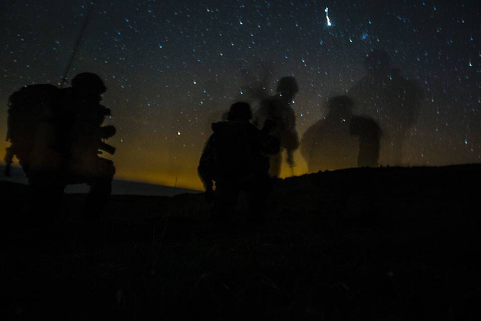 Samen bewegen door lastig terrein is moeilijk in het donker. Mariniers moeten op elkaar vertrouwen en goed en helder communiceren.