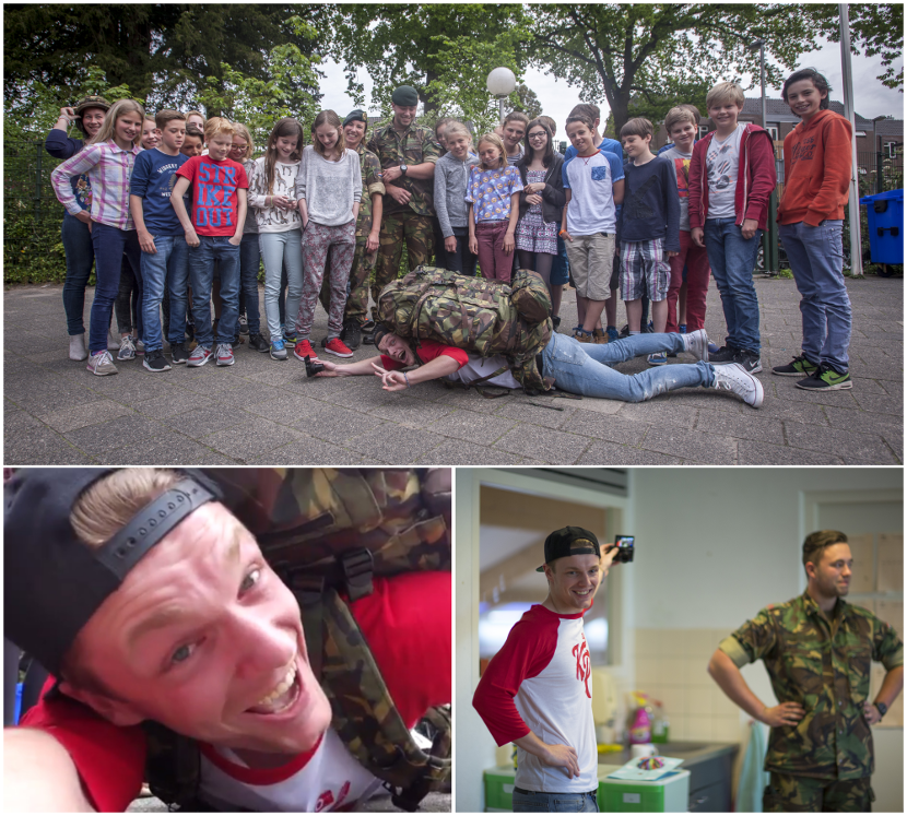 De Bussumse scholieren hadden dubbel geluk: aan het einde van de presentatie stonden zij ook nog eens oog in oog met de populaire videoblogger Enzo Knol. Het tieneridool, bekend van zijn ‘vlogs’ op videokanaal Youtube, trad op als hoofdrolspeler in een korte film die de landmacht voor alle schoolpresentaties had gemaakt.