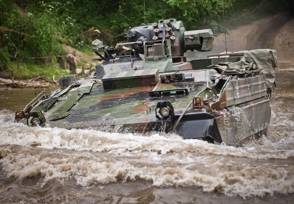 Een Duitse Marder (infanterie-gevechtsvoertuig) van 371 Panzergrenadierbataillon steekt een Pools riviertje over.