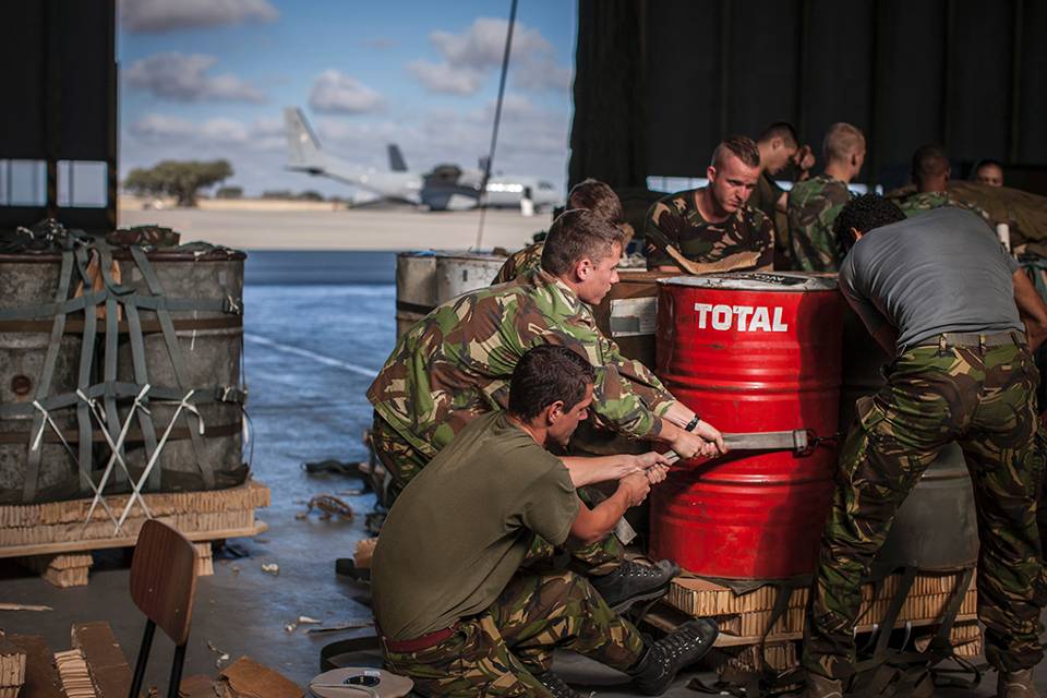 De ground liaison officer is een landmachtmilitair bij het 336 Squadron van de Koninklijke Luchtmacht. Als tussenpersoon zorgt hij ervoor dat de luchtmachters en de landmachteenheid op de grond optimaal kunnen samenwerken. Dat is zeker belangrijk wanneer een airdrop plaatsvindt onder toezicht van buitenlandse collega’s. Die hanteren vaak weer andere procedures. Portugal is wat betreft sergeant-majoor René ideaal. “In deze uitgestrekte oefengebieden kun je nog geen blind paard raken.” De ‘loadie’: Achterin de kist houdt een loadmaster de lading nauwlettend in de gaten. Een spanband en een speciale metalen goot houden de ‘stick’ – de reeks ladingen – op hun plek. Timing, daar draait het om bij een airdrop. In de laatste minuten voor de airdrop opent de loadmaster de laadklep. Pas als het groene licht aanspringt, snijdt hij de strakgespannen verankering aan. Door de spanning op de band scheurt die in 1 keer door. De pathfinder: Pathfinders van 11 Luchtmobiele Brigade vormen de ogen en oren voor de vliegers. Ze zetten de dropzone uit en zien erop toe dat die veilig is en blijft. Kort voor de drop informeren ze de vlieger over de windsnelheid en windrichting. Tot op de laatste minuut kunnen ze de airdrop afblazen, bijvoorbeeld omdat de wind te sterk aanwakkert. Sergeant-majoor Frank: “Wederzijds vertrouwen, daar gaat het om. Een vlieger gooit zijn lading alleen als wij het verantwoord vinden. Veiligheid is het allerbelangrijkste. Als een krat van 800 kilo neerkomt, is dat wel even iets anders dan een vent van 80 kilo.” De vliegers: Met hulp van de computer navigeert het vliegtuig zo precies mogelijk naar de dropzone. De vliegers houden de loadmasters achterin op de hoogte van hun positie en de aanvliegtijd. De lading mag niet te vroeg en ook niet te laat vallen. Boven de dropzone vliegt het toestel laag en langzaam, ongeveer 240 kilometer per uur. De lading: Eén voor één schuiven de ladingen uit het vrachtruim. De parachute aan de pakketten opent direct. Tijdens de training zette de Defensie Para School voor het eerst ook ‘slimme’ parachutes in. Deze vinden dankzij een gps-systeem en een computergestuurd valscherm vanaf grote hoogte zelfstandig hun weg naar het doel. Daar landen ze tot op 5 meter nauwkeurig. Ze zijn bedoeld voor de bevoorrading van speciale eenheden in vijandig gebied. De opruimploeg: De Portugezen halen de parachutes in. Ze takelen de gedropte lading op hun vrachtwagens. Terug naar de basis. Om alles weer klaar te maken voor een nieuwe airdrop.