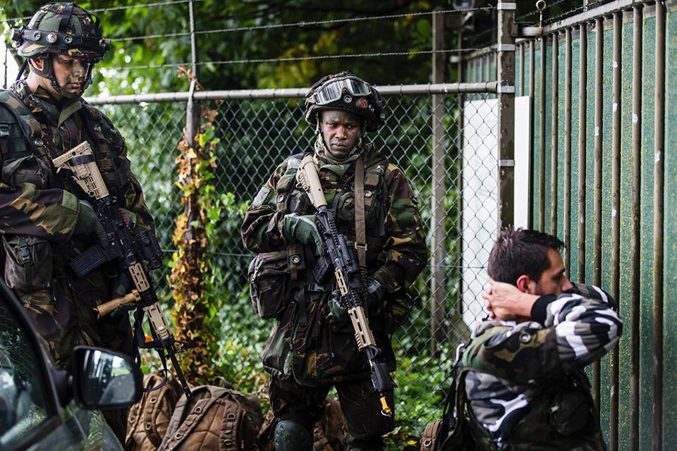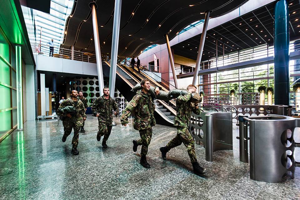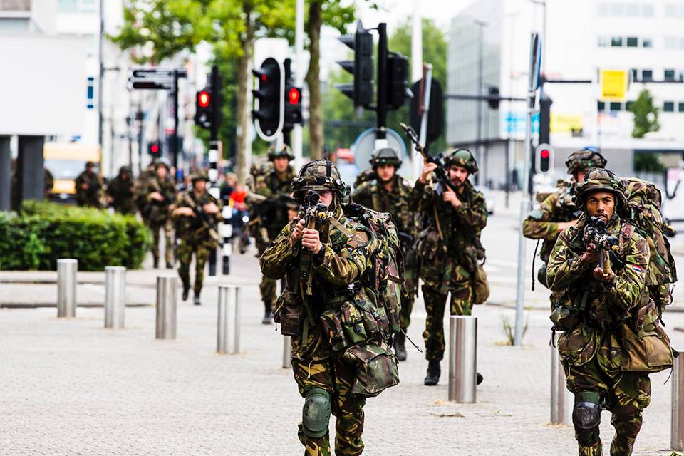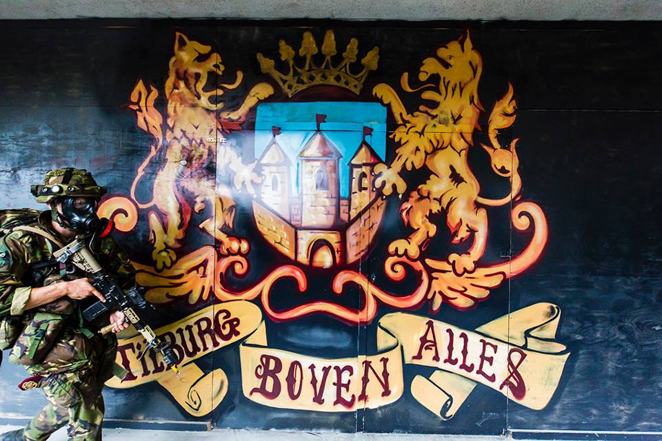 Voor het markante Interpolispand in Tilburg begint de volgende opdracht. De militairen moeten 19 verdiepingen omhoog lopen om een gewonde collega op te halen. Het trappenhuis van het kantoorcomplex doet benauwd aan. “Kom op jongens, nog een paar treden”, zweept een van de soldaten zijn collega’s op. Met rood aangelopen hoofd komt de eerste groep bezweet aan. Hijgend tillen zij het dummyslachtoffer, een zandzak van 80 kilo, op hun schouders. Voorzichtig, maar toch nog met een behoorlijke snelheid begint de tocht terug. Verbaasde blikken van omstanders leiden de militairen nauwelijks af. “Het mooie van een oefening in bewoond gebied is het contact met de burgers”, aldus de commandant.
