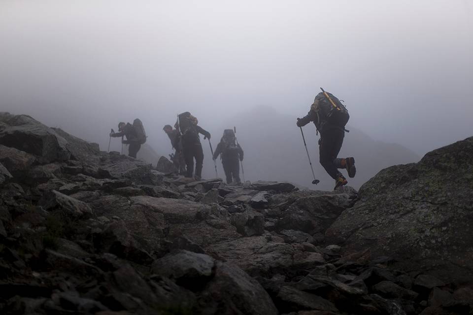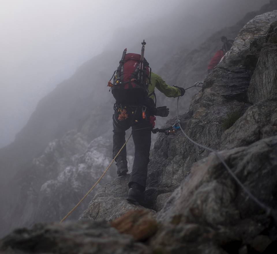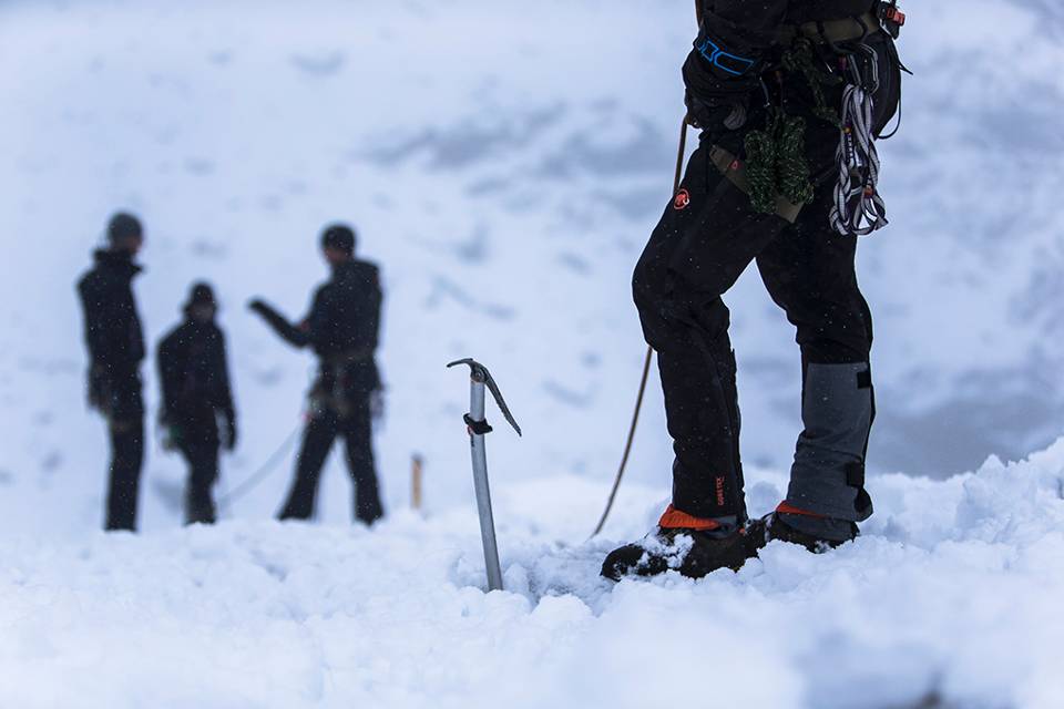 “Dit is een prachtkans”, vervolgt de kleine Brit. “De contacten zijn al jaren goed omdat Nederlanders in Engeland trainen om ML-er te worden. Altijd goed om elkaar weer tegen het lijf te lopen. Maar dit is echt uniek! En het is natuurlijk spannend om te zien wie er naar Nepal mag. Ze selecteren ook 2 Britten. Iedereen is erop gebrand op die lijst te komen.” Keenan checkt de lijn die naar zijn collega’s loopt en slaat de sneeuw van zijn jas. Want waar de mannen gisteren nog in de regen liepen, valt vandaag een dik pak witte vlokken. “Als je me had verteld dat het november was in plaats van augustus, had ik je ook geloofd”, roept een Nederlandse ML-er gekscherend voordat hij zijn bergklimbijl in het ijs slaat. De weersomslag deert de geharde militairen geenszins. “Dit Alpenavontuur is een kolfje naar onze hand”, glundert Boumeester terwijl hij geconcentreerd afdaalt langs een ijzige helling.