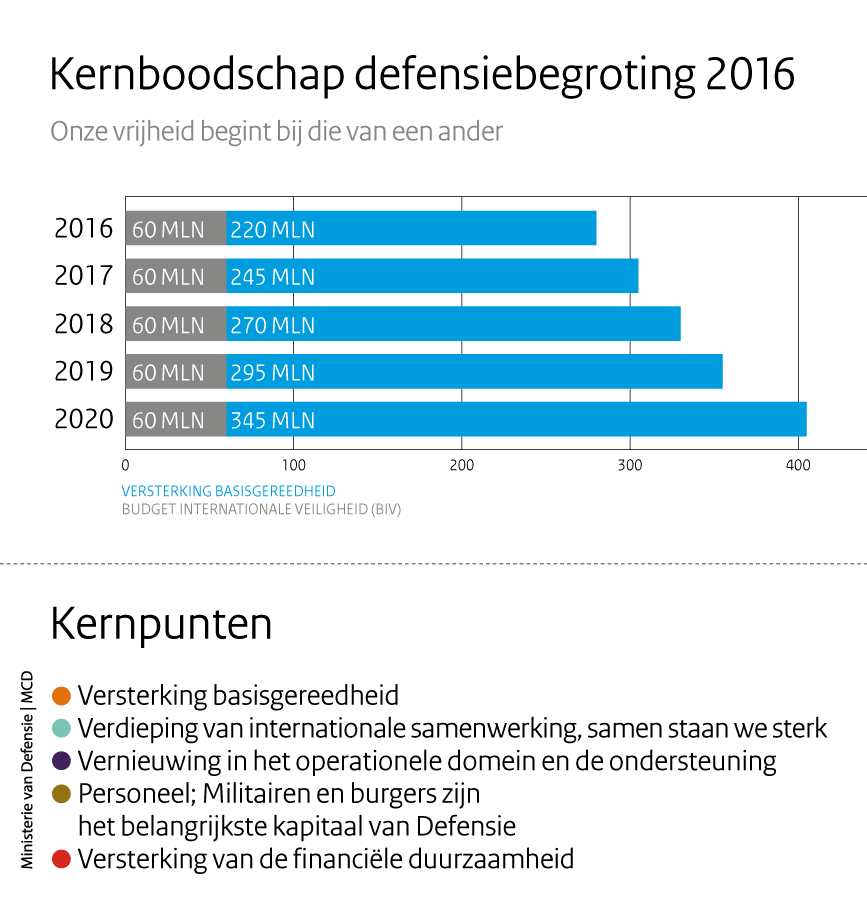 In totaal is voor Defensie in 2016 een bedrag van 8,2 miljard euro begroot. Dit geld is bedoeld voor een effectieve krijgsmacht die zowel nationaal als buiten de grenzen daadkrachtig kan optreden, in samenwerking met de bondgenoten van de NAVO en EU. Hiervoor heeft Defensieminister Jeanine Hennis-Plasschaert enkele hoofddoelen opgesteld.