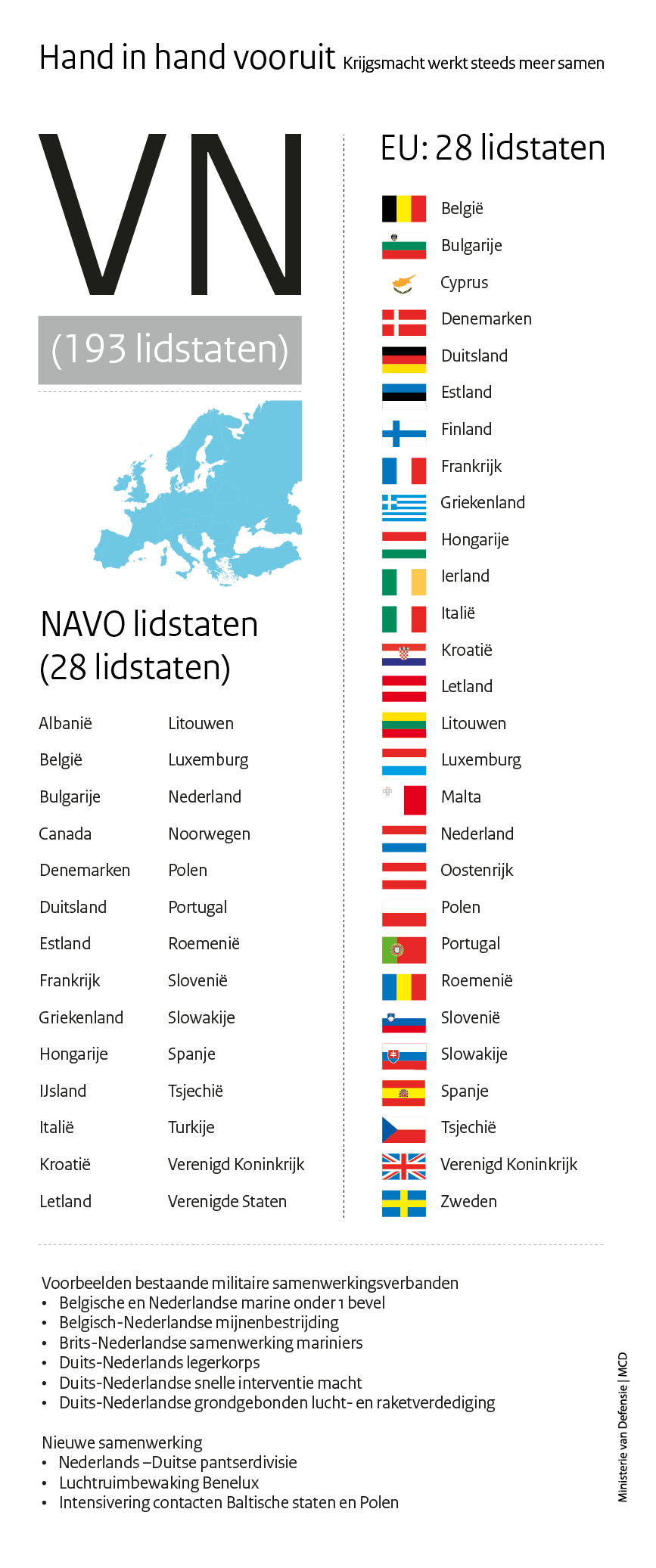 We kunnen en willen het niet alleen. Onze krijgsmacht voert operaties zelden alleen uit. Samenwerking met bevriende krijgsmachten is het toverwoord om kosten te besparen en kennis en ervaring uit te wisselen. Ook bij gezamenlijke materieelaankopen, onderhoud én personele training blijkt samenwerking een goede suggestie.