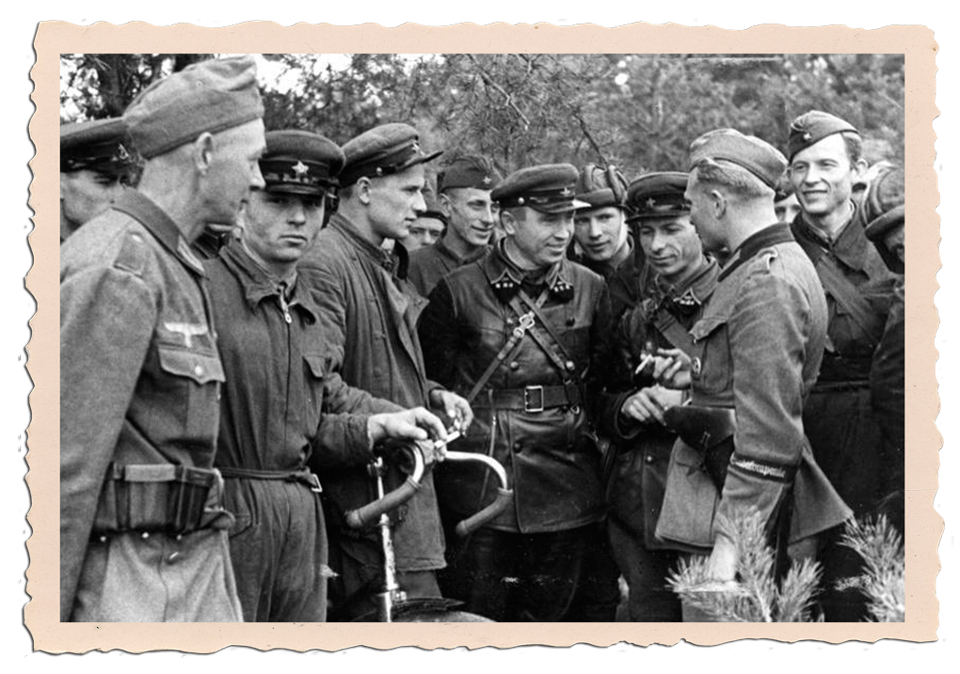 is te zien hoe Duitse en Russische troepen elkaar in vriendschap ontmoeten.