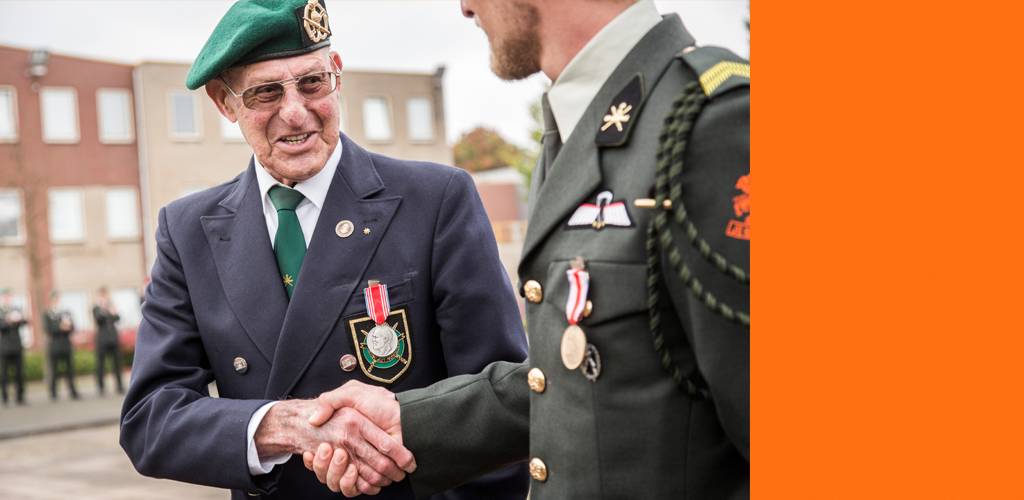 Adjudant b.d. Willem Scheringa (links) en korporaal 1 Wim schudden elkaar de