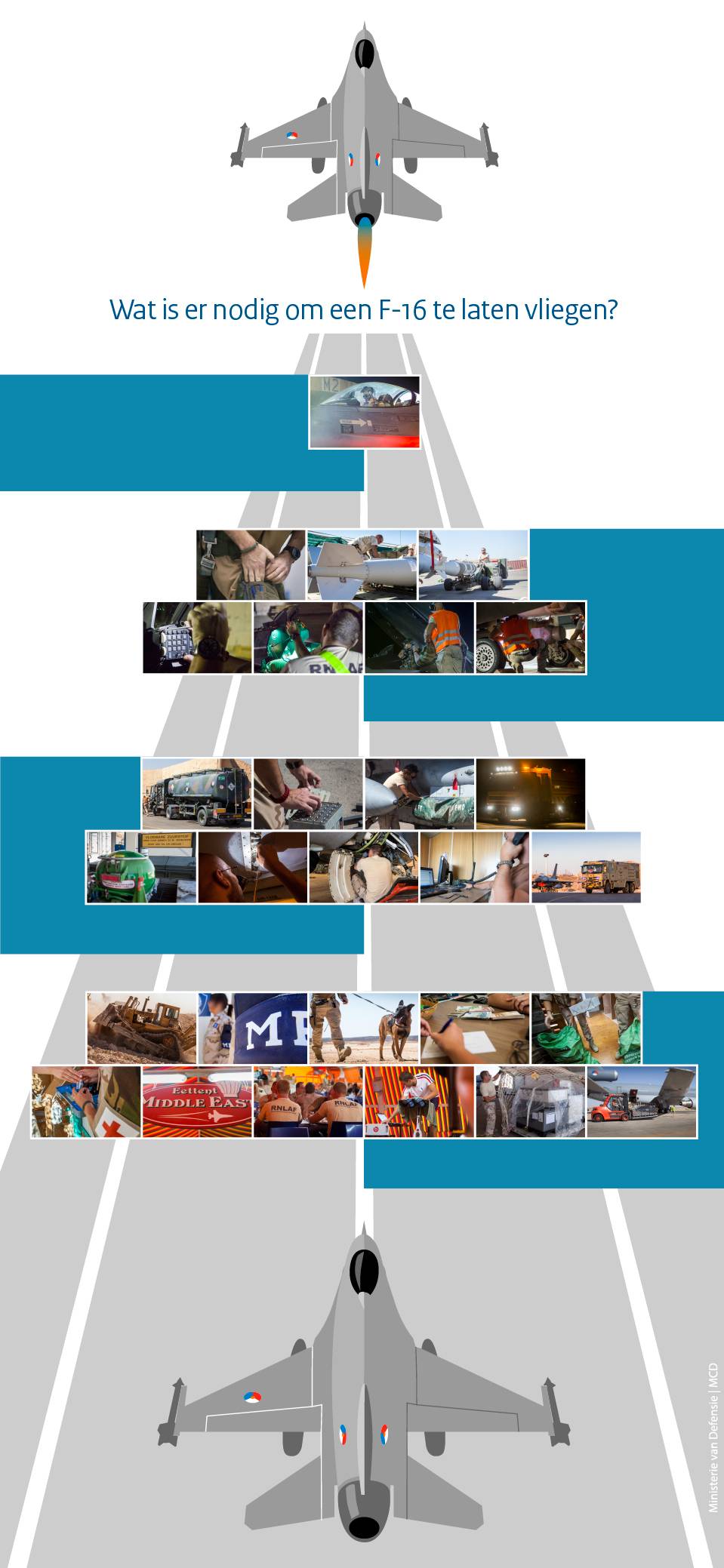 Ruim 1 jaar lang Nederlandse F-16 operaties in het Midden-Oosten. Daarvoor is een detachement van rond de 200 man nodig. Klik op de ‘hotspots’ in deze piramide en lees – met de klok mee vanaf 12 uur – welke vakgebieden allemaal nodig zijn om de F-16’s in de lucht te krijgen.