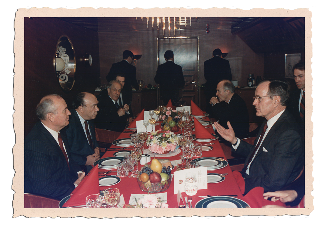 George W. Bush en de Sovjetpresident Michail Gorbatsjov ontmoeten elkaar aan
