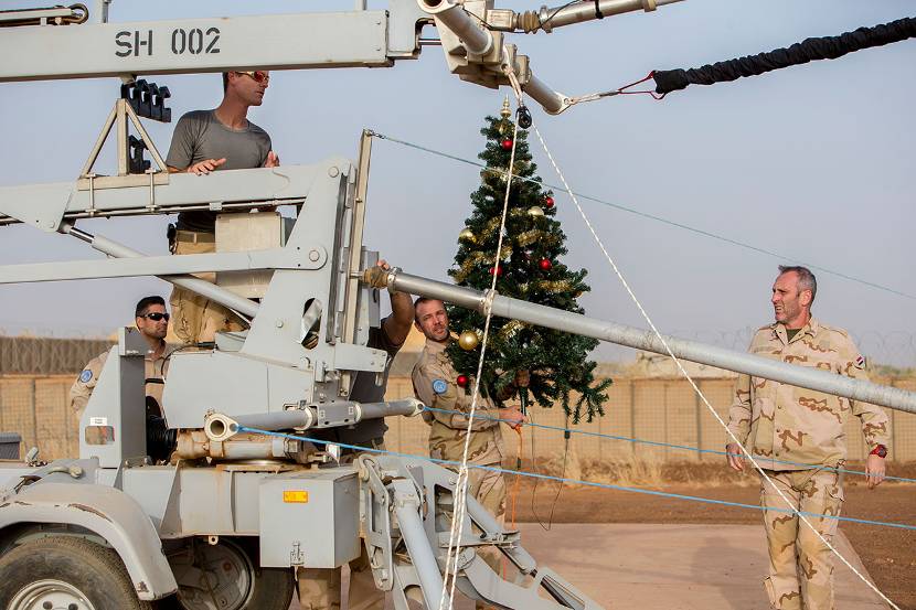 De thermometer op Camp Castor tikt overdag met gemak 30 graden aan. Zeker voor Nederlanders geen gebruikelijke waarde zo rond de kerst. Met kerstballen, slingers en lampjes komt het kamp langzaam in een feestelijke stemming.