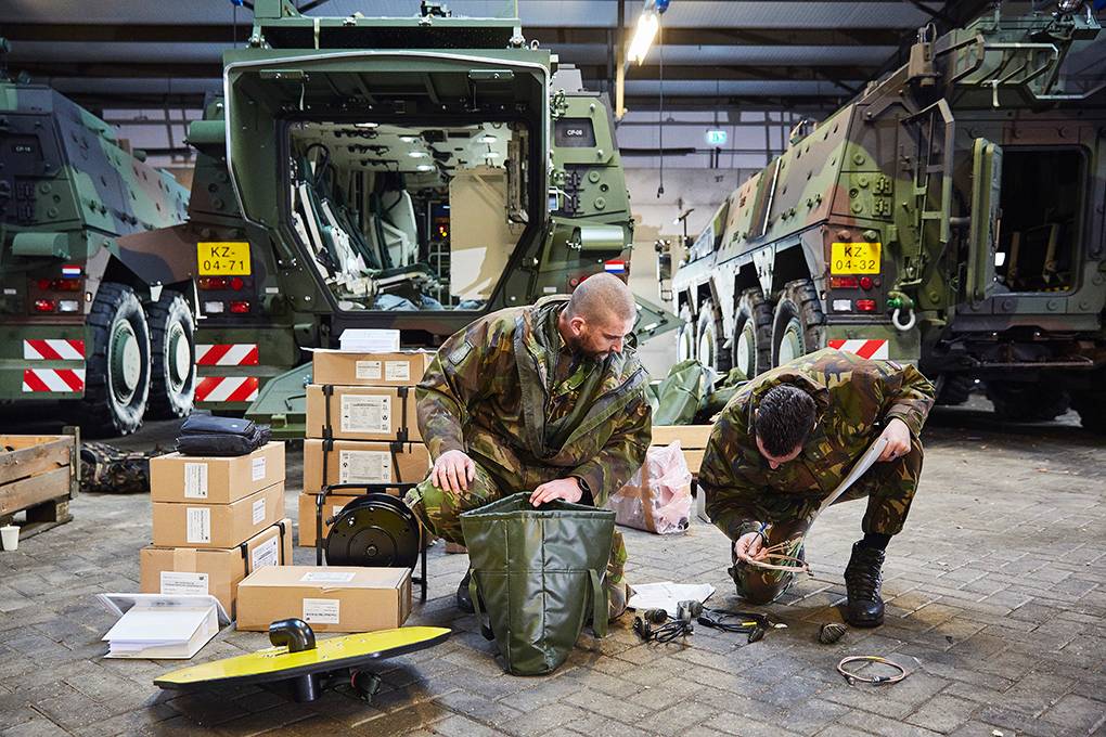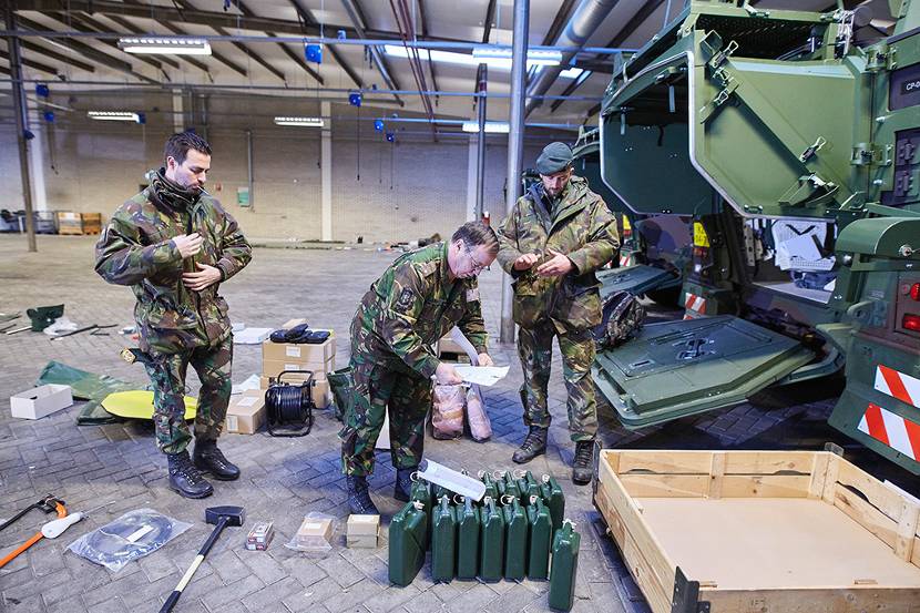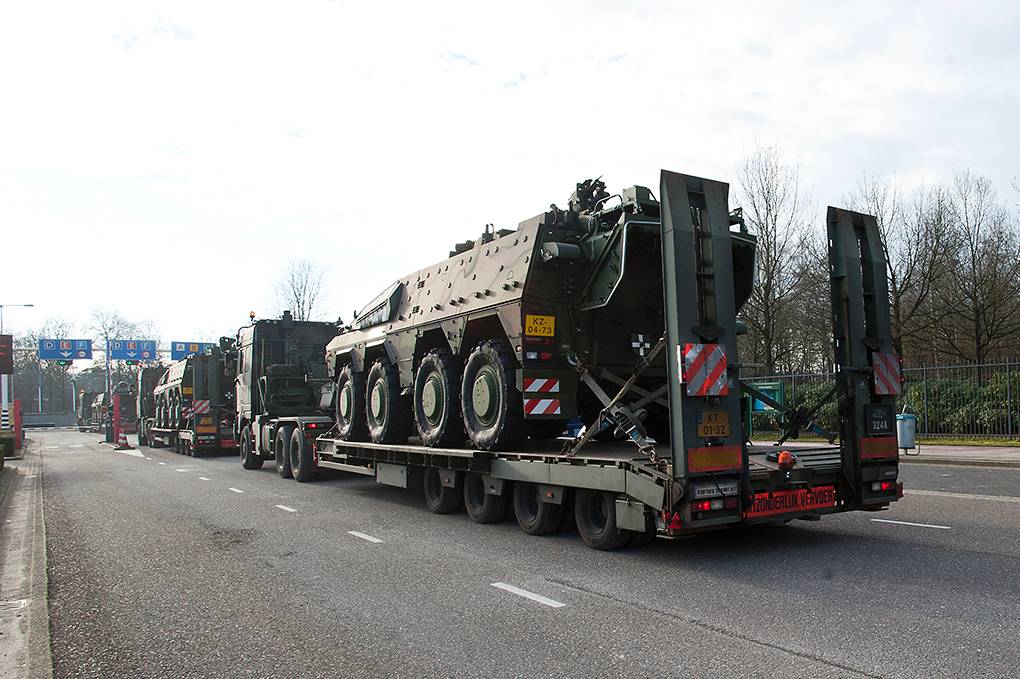 De 8-wielige zwaargewichten gaan met militaire precisie op een dieplader. Met evenveel accuratesse heeft beheerder sergeant 1 Mike van het 17e eerder de gehele inventaris gecontroleerd die achter de gepantserde kolos ligt uitgestald. “Want”, zegt adjudant Frans Verrijt van het Instroom Begeleidingsteam (IBT): “Wij moeten ervoor zorgen dat de klant alles piekfijn in orde krijgt aangeleverd, aan de hand van een detaillijst.”