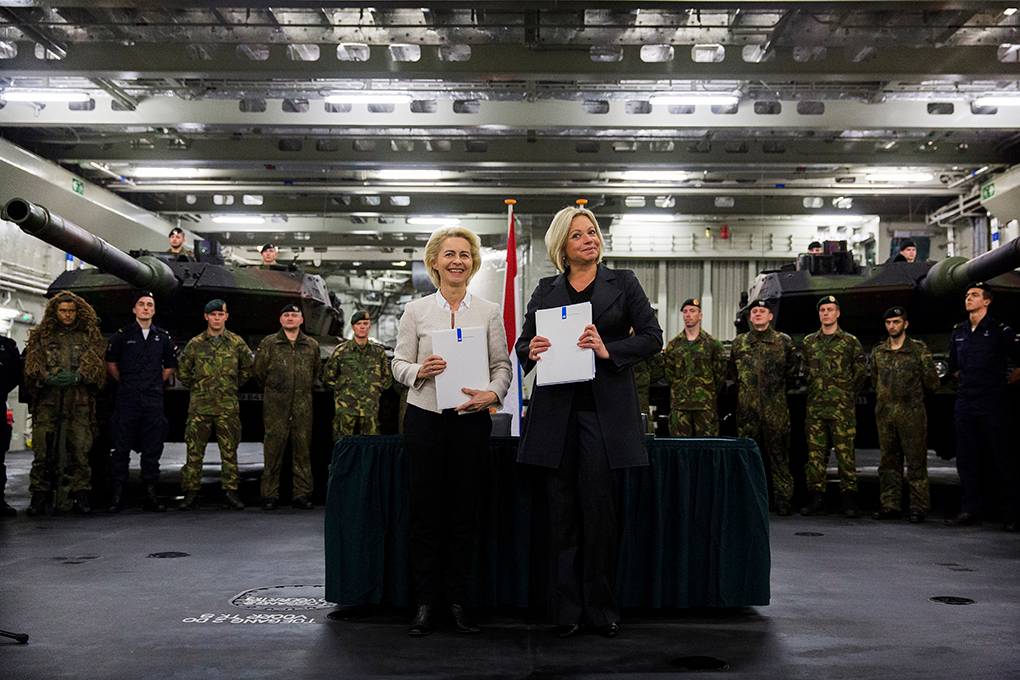 Minister van Defensie Jeanine Hennis-Plasschaert en haar Duitse collega dr. Ursula von der Leyen bekrachtigden de nauwere militaire samenwerking op 4 februari aan boord van de Karel Doorman in Amsterdam.