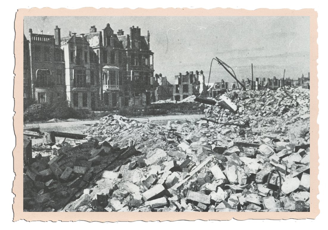 Het Juliana van Stolbergplein in de Haagse wijk Bezuidenhout na het bombardement. Foto: Nederlands Instituut voor Militaire Historie.