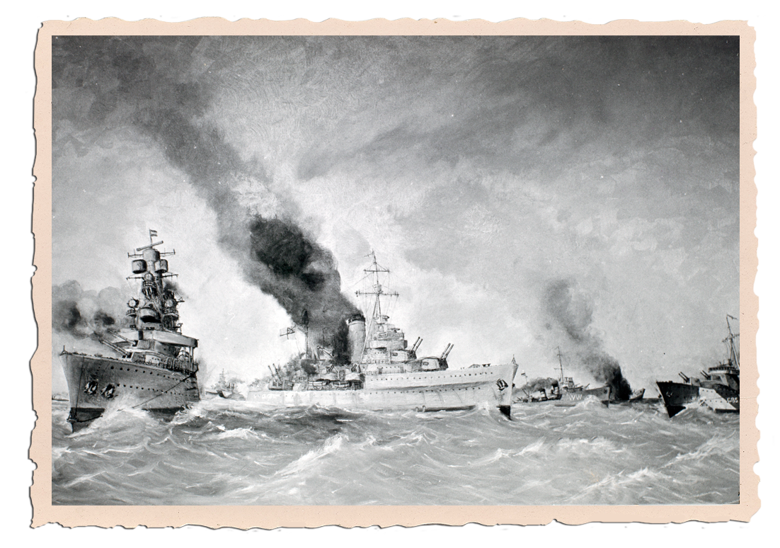 Schilderij van de Slag in de Javazee. Van links naar rechts: 2 Amerikaanse torpedobootjagers, Hr.Ms. De Ruyter, HMAS Perth, HMS Exeter, Hr.Ms. Witte de With, de zinkende Hr.Ms. Kortenaer, HMS Jupiter. Foto: Nederlands Instituut voor Militaire Historie.