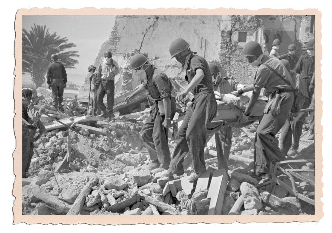 Nederlandse marinemensen bergen lichamen uit het Marokkaanse Agadir na een aardbeving. Foto: Nederlands Instituut voor Militaire Historie