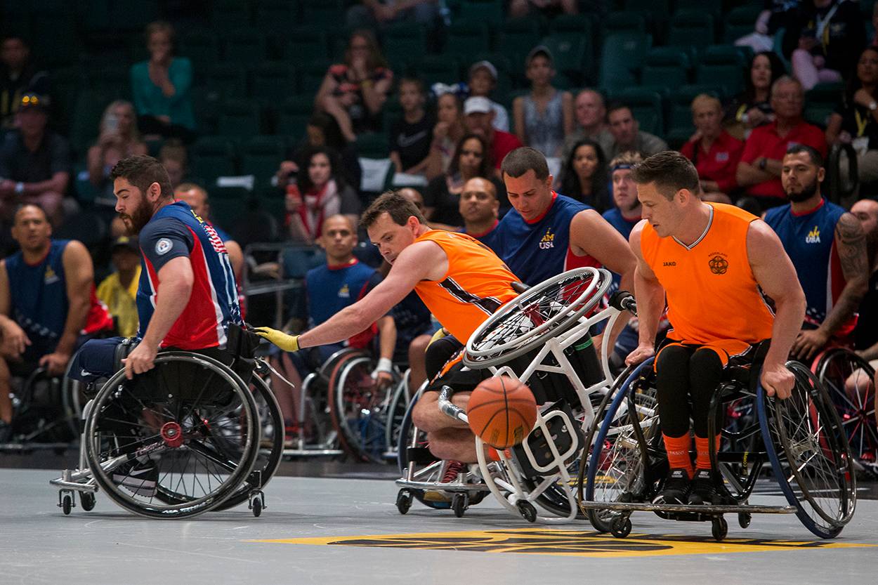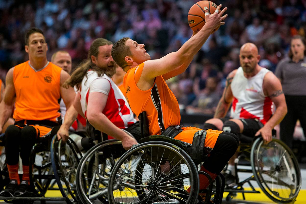 Het HP Field House op het immense ESPN Wide World of Sports-complex is de plek waar de prijzen worden verdeeld. Een arena omzoomd door toeschouwers, gevuld met stampende beats. Uit de rook doemen de matadoren op. Grootmachten Groot-Brittannië en de Verenigde Staten treffen elkaar in de strijd om goud, Nederland en Denemarken knokken om brons. Voor de debutanten van Oranje is hun plek in de troostfinale een prestatie op zich. Maar op de laatste dag van de Invictus Games willen ze meer.