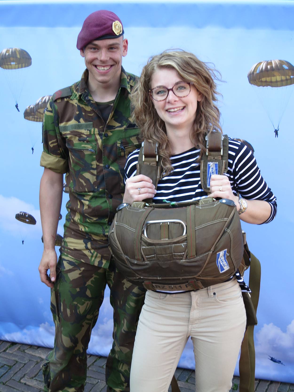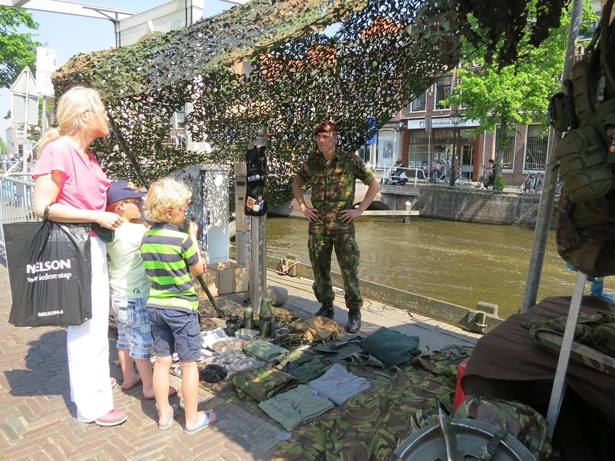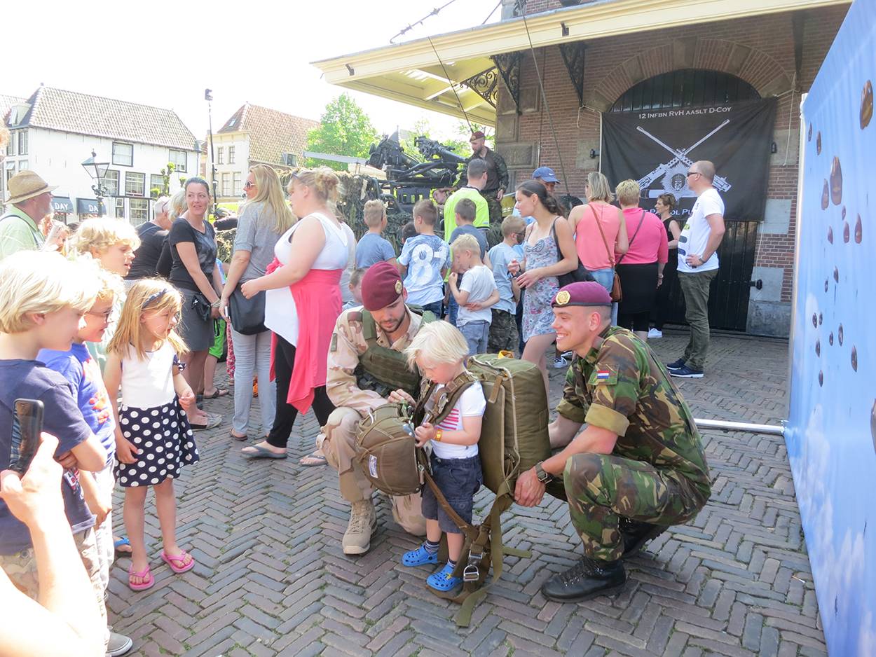 Het zijn vooral kinderen, die met onuitputtelijke energie en enthousiasme samen met hun (groot)ouders over het Waagplein lopen. Vooral de allergrootste wapens zijn populair. Niet verwonderlijk, want ze zijn groot, imposant én zwaar. De panzerfaust weegt zelfs 12 kilo. En dat is nog niets vergeleken met een volle bepakking. De dappere militairen in het groen moeten met gemak zo’n vijftig kilo op de schouders kunnen dragen. Een rugzak vol met onder meer kleding, eten, bestek, EHBO-spullen, een schep en gaspitje. Of de parachutistenrugzak van circa 20 kilo, waarmee de militairen met tientallen tegelijk uit een vliegtuig springen.