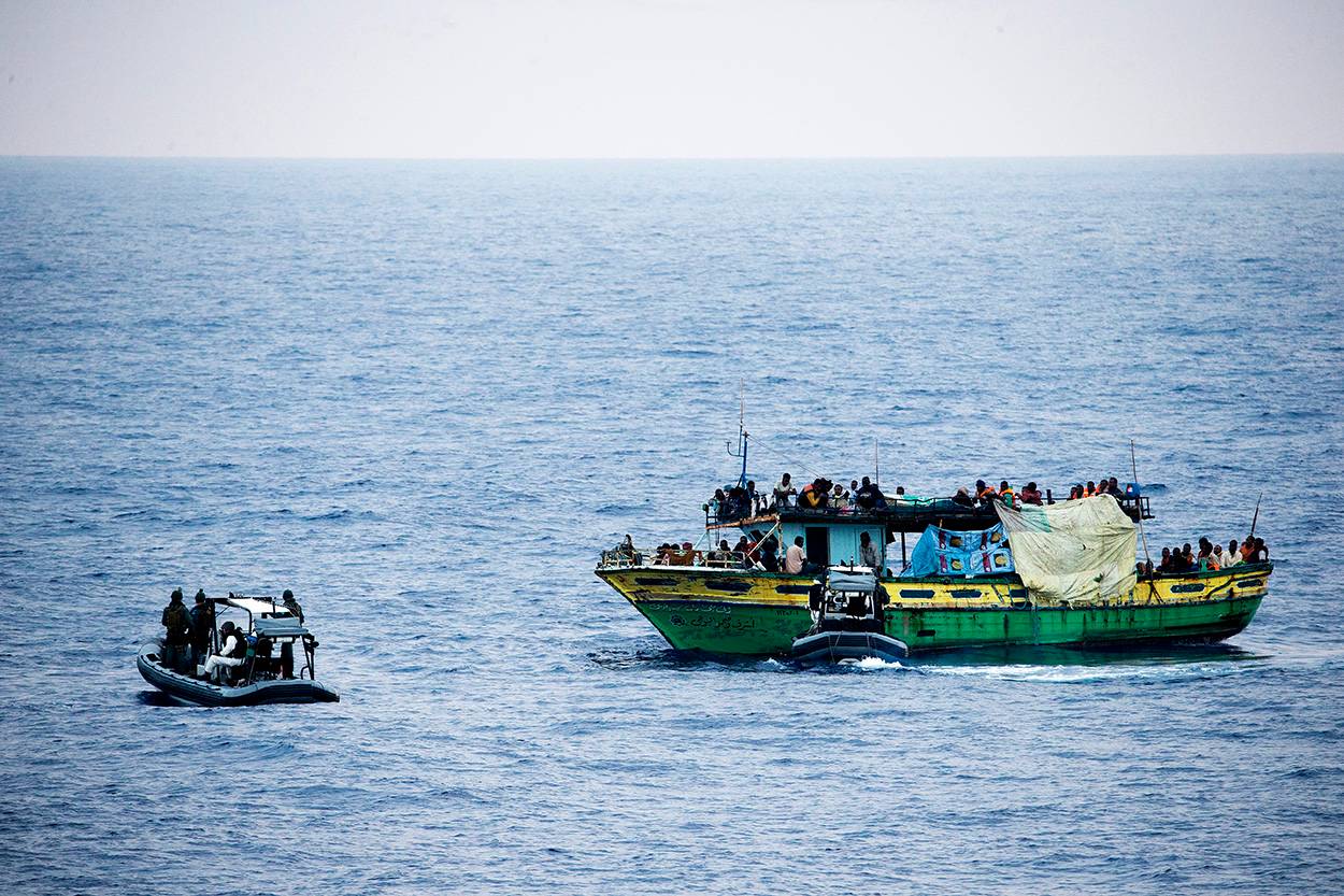 Als de eerste melding over het derde scheepje vol migranten, een houten vissersboot, binnenkomt gaat de Van Amstel meteen uit de startblokken. Een Portugees maritiem patrouillevliegtuig stuurt een foto van het overvolle bootje. Bij dageraad komt het groen-gele schip in zicht van het Nederlandse fregat. “Het is zaak dat de migranten dan niet in paniek raken en allemaal aan een kant gaan staan. Anders kan het scheepje kapseizen en dan ontstaan er echt problemen”, zegt sergeant van de mariniers Paul. “Vandaar dat de guardteams (gevormd door zowel personeel van vloot als mariniers) met de RHIB's het bootje van beide zijden benaderen.”