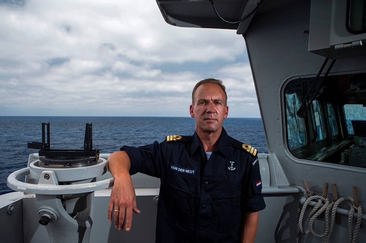 “Het valt gelukkig allemaal op z'n plaats”, schetst commandant Zr.Ms. Van Amstel, kaptein-luitenant ter zee Dick van der Neut, op de brug van het schip. “De eerste week dat wij voor Frontex patrouilleerden, zaten we in een vak bij Libië, achter de schepen van de Italiaanse kustwacht en de non-gouvernementele organisaties. Pas toen we zijn verschoven naar een gebied tussen Kreta en Sicilië begon het in een keer. Gelukkig zijn die acties uitstekend verlopen, tot en met een onverwachte bevalling aan boord toe.”