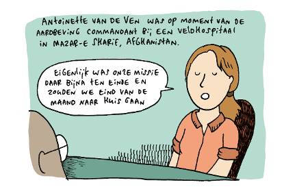 Het NAVO-veldhospitaal in Pakistan: een hulppost om slachtoffers van de aardbeving in oktober 2005 te behandelen. Antoinette van de Ven is de commandant van het hospitaal, waar per dag tussen de 150 en 180 mensen worden behandeld. Soms wegens gebrek aan ruimte noodgedwongen in de open lucht. Zelf helpt de commandant ook zo veel mogelijk mee. Als ze bij de geboorte van een kind assisteert bijvoorbeeld. Het meest frustrerende aan zo’n missie? “Je kunt niet iedereen redden.”