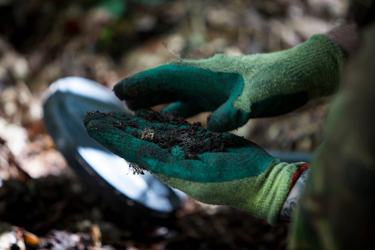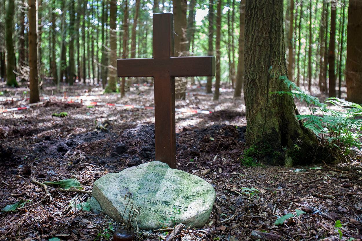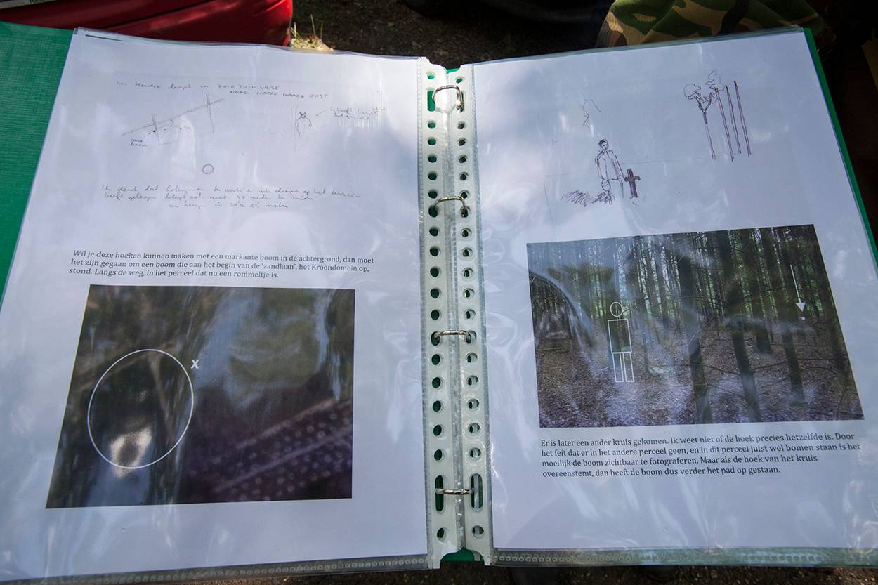 Rood-wit-linten hangen tussen de bomen. Op de grond zijn witte strepen getrokken met UXO-spray. Zo weten de genisten precies welk gebied ze al hebben omgespit. In verschillende teams doorzoeken ze het gebied. Als eerste kijken ze bij de meest waarschijnlijke plek, ongeveer 25 meter links van de executieplaats van Van Kempen.
