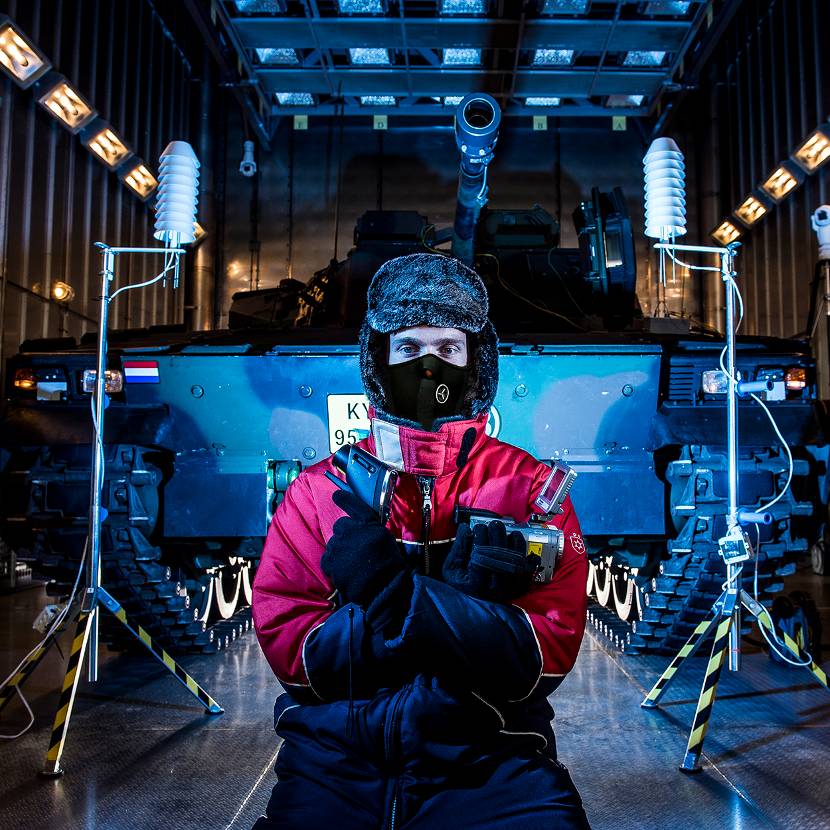 We testen zowel nieuw als bestaand materieel. Klimaatproeven van producten die we al langere tijd in gebruik hebben, beperken zich meestal tot bepaalde problemen die de gebruiker ervaart of specifieke klimaattesten met betrekking tot het gebied waar het materieel op korte termijn ingezet wordt. Vaak gaat het om testen van basisfunctionaliteiten zoals het bevriezen van deurrubbers en de werking van de verwarming of airco bij extreme buitentemperaturen. Verder controleren we natuurlijk of de krachtbron en specifieke apparatuur zoals computers aan boord van een voertuig nog functioneren. Binnenkort gaan we een nieuw Barracuda camouflagesysteem van het pantserrupsvoertuig CV9035NL beproeven. Het net zou namelijk een positieve werking hebben op de te hoge temperatuur bovenin de toren van het voertuig bij een warm klimaat. Aan ons de taak om te onderzoeken of het systeem daadwerkelijk een verbetering geeft.”