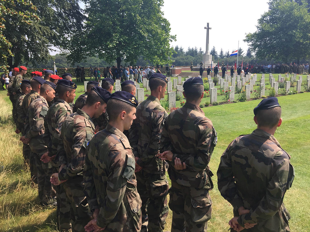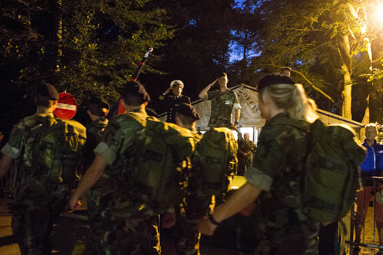 De jubileumeditie kreeg een koninklijk tintje, dankzij een bezoek van koning Willem-Alexander. Hij ging onder meer bij genisten van 105 Geniecompagnie Waterbouw langs die een vouwbrug over de Maas had aangelegd tussen Cuijk en Mook. De koning kreeg uitleg over de militaire overspanning, luisterde naar het regimentslied en werd getrakteerd op het traditionele glaasje brandewijn. Militairen uit landen als Frankrijk, Duitsland, Zweden en Noorwegen vertrekken ’s ochtends in alle vroegte vanuit het militaire kamp Heumensoord. Dat ligt midden in het bos bij Nijmegen en bestaat uit een grote eettent, een feesttent, een uitgebreide medische post en veel grote slaaptenten. Onderweg vinden allerlei leuke initiatieven plaats om iedereen een onvergetelijke dag te bezorgen. Zo verrast de Duitse Reservisten Gruppe Süd bewoners van verpleeghuis Veste Brakkenstein in Nijmegen met een ballade. Veel kinderen reageren enthousiast op de voorbijlopende militairen en geven hen maar al te graag een ‘high five’. De Zwitserse delegatie wordt enthousiast welkom geheten op Heumensoord door hun eigen meegebrachte promotie- en welkomstcomité. De Zwitserse lopers zijn net onder de bijzondere poort doorgelopen bij de ingang van het kamp, met de enorme legerhelm en -kisten. De legerkisten waarop, als het even kan, alle deelnemers bij vertrek 'afkloppen' voor een goede afloop. Militairen van 13 Herstelcompagnie uit Oirschot zijn onderweg naar Beuningen. Tijdens de 100ste Vierdaagse vieren ze ook hun eigen jubileum: het 65-jarig bestaan van hun compagnie. Kapitein der mariniers Theo van Kaathoven probeert zijn team na binnenkomst in de feesttent op Heumensoord te belonen met een snoepje of ontbijtkoek. Ze trappen er niet in en kiezen voor een biertje. Milicien Juan Martijn uit Aruba wordt langs de kant voor zijn eerste blaar behandeld door een collega. Veel wandelaars hebben een eigen medische kit bij zich voor noodgevallen onderweg. De fanatieke miliciens van de Arubaanse Militie lopen de Vierdaagse in hun vakantie. Op Groesbeek Canadian War Cemetery herdenken Canadese militairen collega’s die gesneuveld zijn tijdens de Tweede Wereldoorlog. "Naast het uitlopen van de Vierdaagse is deze herinneringsbijeenkomst het belangrijkste evenement voor ons”, zegt een van de Canadese militairen. Luitenant-ter-zee (A) 2OC Caroline Hellendoorn en majoor Tonnie Dulk inspecteren de passerende eenheden op correct tenue voor de uitreiking van het felbegeerde Vierdaagsevaantje. Vlak na het dorp Plasmolen passeert een detachement van het Korps Nationale Reserve uit Amersfoort. Voor sommige militairen is het lastig om te bepalen of het tropenhoedje of de baret op moet. “Jullie maken er wel een petje van”, grapt een militair die wordt gecorrigeerd omdat hij op het verkeerde moment een tropenhoed droeg. Op de derde dag is het voor de wandelaars ook weer heerlijk om natgespoten te worden. Brand- en tuinslangen, steigers met sproei-installaties, tuinsproei-automaten, cementkuipen met water (waar de hond ook rustig uit meedronk), ballonnen en alles waar water in zit of uitkomt, brengt enige verkoeling, wat de loop- en feestvreugde verder verhoogt. De Amerikaanse luitenant-kolonel Green loopt voor de 9e en laatste keer de Vierdaagse. Binnenkort gaat hij met pensioen en wordt hij leraar scheikunde. Hij zal alle 'meer dan vriendelijke' Nederlanders missen. Vooral die keer toen hij helemaal stuk ging en zelfs een vrouw van 85 aanbood om z'n rugzak te dragen. “Als zij het aandurft, dan moet ik het ook kunnen”; die gedachte hield hem op de been. Voor de 3e achtereenvolgende keer won 11 Bevoorradingscompagnie van 11 Luchtmobiele Brigade het Vierdaagsevaantje van de landmacht als meest representatieve detachement. De eenheid scoorde hoge ogen vanwege de 'wow-factor', aldus plaatsvervangend Commandant Landstrijdkrachten generaal-majoor Martin Wijnen. Hij reikte de prijs uit aan de detachementscommandant, majoor Nol van de Wiel. Op de 4e en laatste dag begroeten hoge officieren van de krijgsmachtdelen ('saluting officers') de militairen op de St. Annastraat in Nijmegen, die zoals altijd bij het slotakkoord van de Vierdaagse is omgedoopt tot Via Gladiola. Vol trots lopen de militairen met hun gladiolen en zeker 160 kilometer in de benen over de overwinningsstraat. De vele omstanders ontvangen de helden vol enthousiasme.