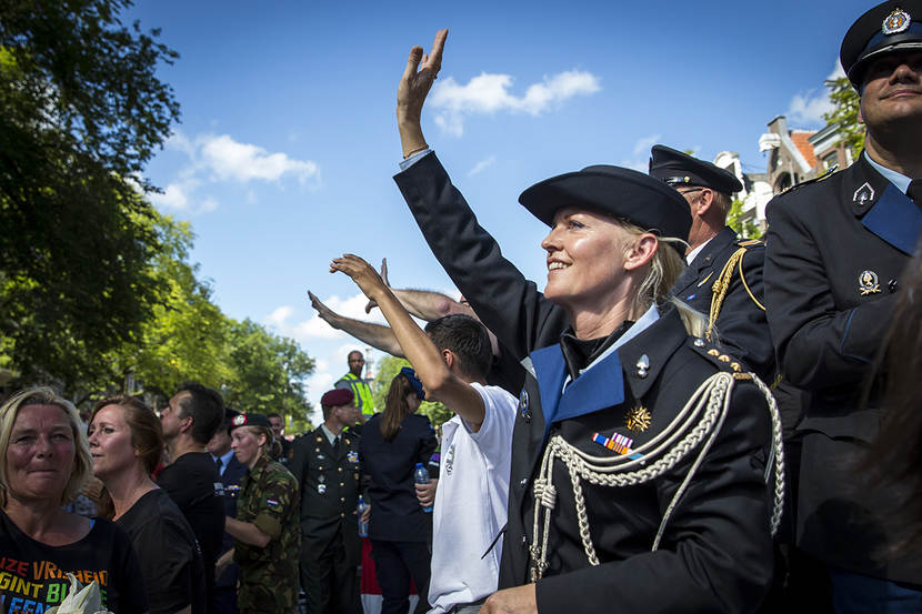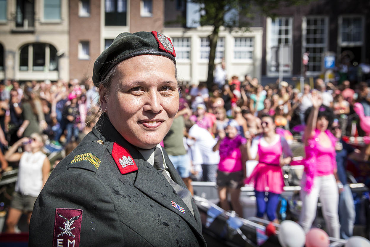 Defensie is voor het zesde jaar op rij een opvallende verschijning in de bonte stoet van 80 boten. Het publiek toont met een stilte gevolgd door gejuich respect voor de saluerende militairen aan boord. “Ik krijg hier zo’n energie van”, zegt de lesbische sergeant Sharon Suetens met kippenvel op haar armen. “Het voelt alsof de menigte ons op handen draagt.” Ook Broks is onder de indruk van de reactie van het publiek. “Volgens mij hebben we als Defensie op een ingetogen maar feestelijke manier de pride-gedachte uitgedragen.”