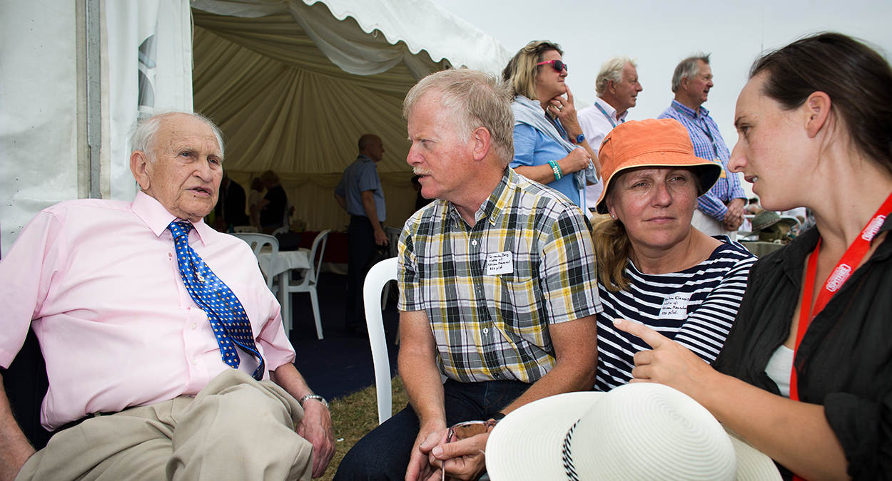Met de aanwezigheid van het kwartet 90+’ers kwam de geschiedenis werkelijk tot leven op Dunsfold RAF. Bijvoorbeeld voor Anneke Volkers, een Engelse met een Nederlandse naam. Zij had lange tijd geen idee dat haar overgrootvader, Adriaan Manschot, een oorlogsheld was die tijdens een noodlottige botsing tussen 2 Mitchells boven België is omgekomen. Haar oma werd pas na zijn sneuvelen geboren. “Adriaan”, herinnerde Edward Hoenson zich, “was een prachtkerel.” Anneke Volkers hing aan zijn lippen en was helemaal beduusd na de ontmoeting, die zeker een half uur duurde. “Lang heb ik door het noodlot niets geweten over Adriaan Manschot en nu kan ik nog met iemand spreken die hem heeft gekend. Het is onwerkelijk.”