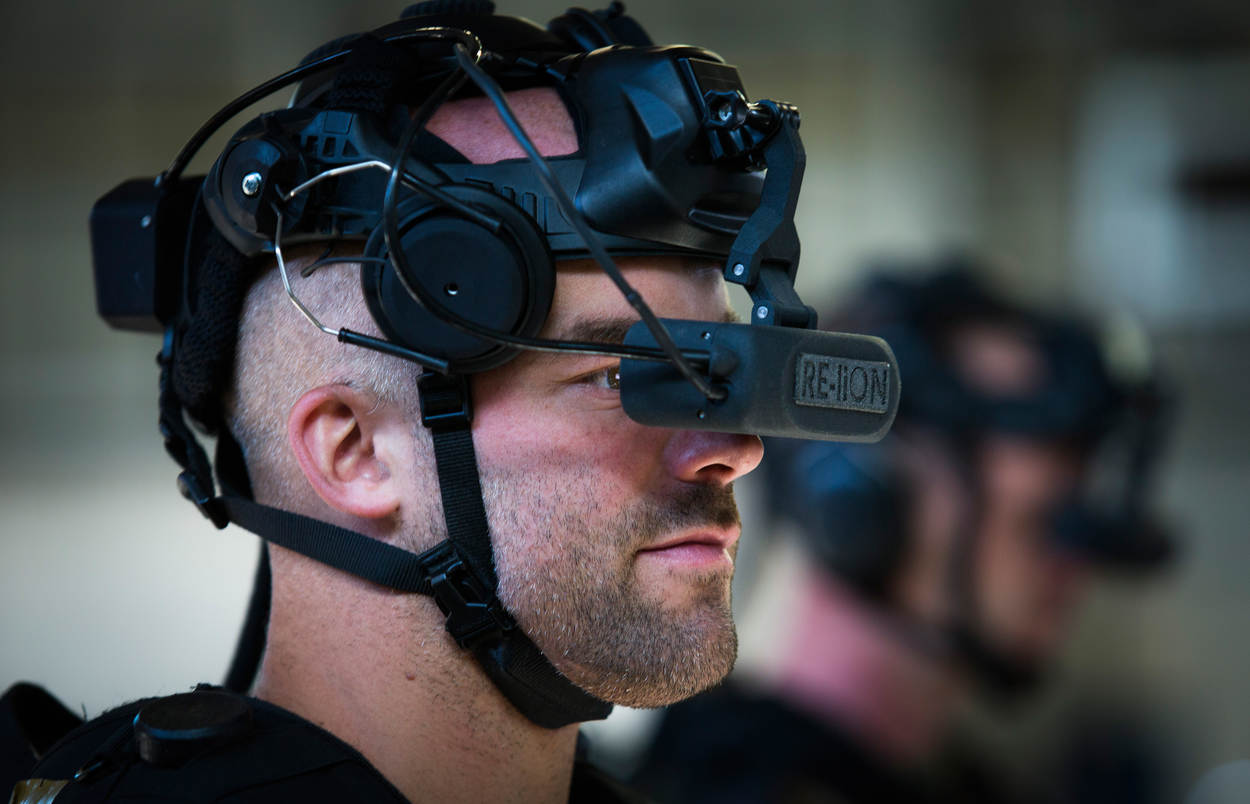 Een tiental palen met sensoren markeert in Schaarsbergen het virtuele speelveld in hangaar 2. Als ik de ruimte binnenloop, bewegen soldaat-1 Jessy van der Wal en korporaal Willem Stienen zich over een lege vloer. “Get on your knees”, schreeuwt één van hen. Voor mij lijkt het een open, kale ruimte, maar door hun bril zien de militairen een Afghaanse quala of een westers gebouw.