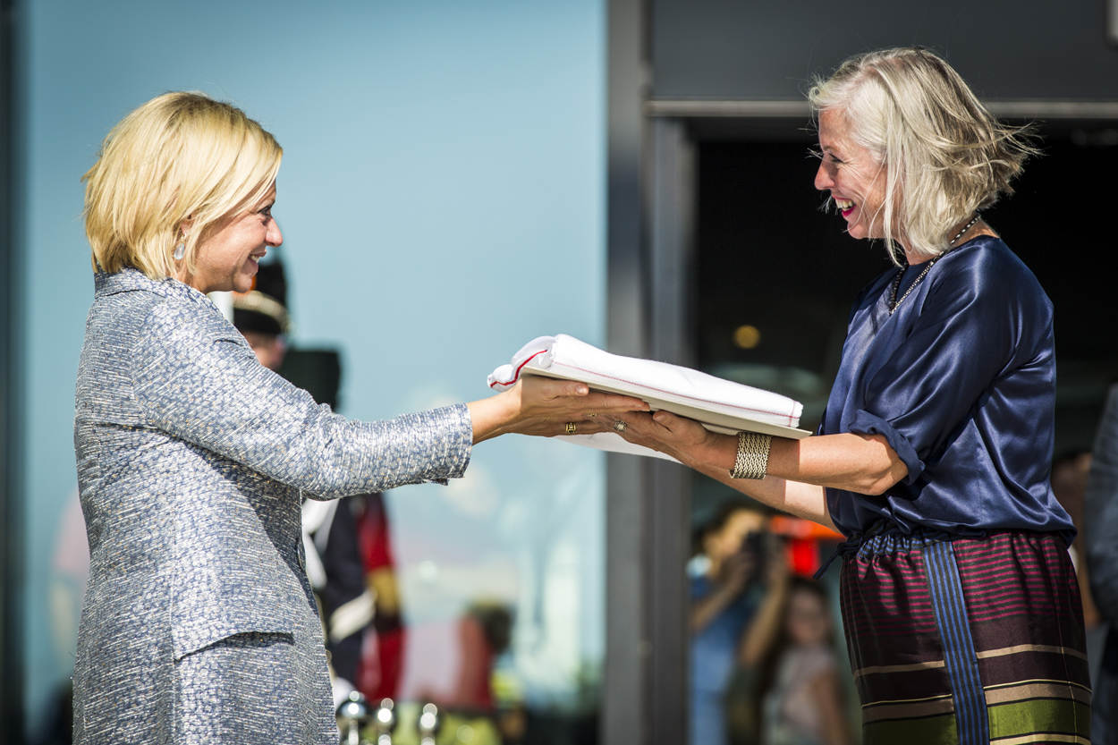 De vlag arriveerde eerder per Chinook transporthelikopter bij het museum in Soesterberg en werd door een erehaag van Amerikaanse en Nederlandse militairen naar minister Jeanine Hennis-Plasschaert gebracht. Zij overhandigde het dundoek vervolgens aan het museum met de woorden: “Deze vlag moet ons eraan herinneren dat vrijheid nooit vanzelfsprekend is. Samen moeten we ons uiterste best doen om de waarden hoog te houden, waarvoor de helden van D-Day bereid waren te sterven.”