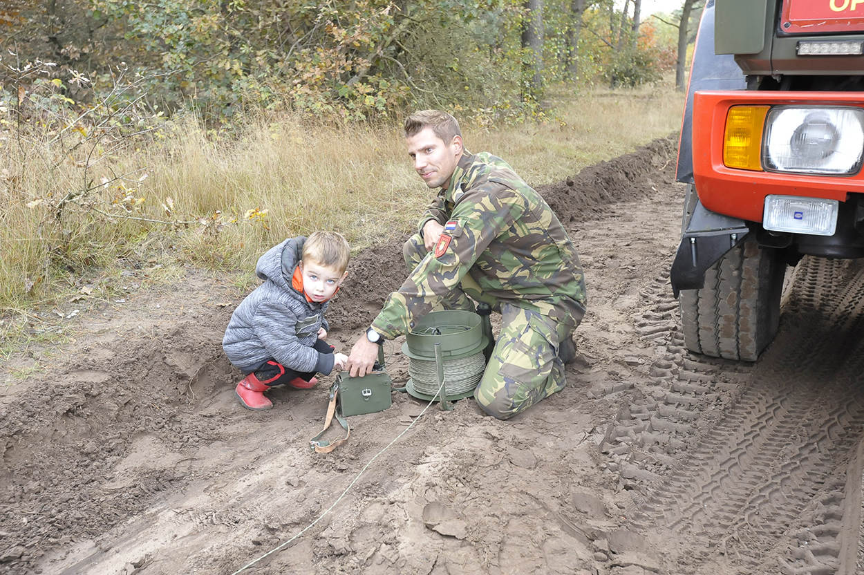 Op het oefenterrein van 13 Lichte Brigade krijgt de 3-jarige Merlijn Sprengers de eer om de rode knop in te drukken. Tegen die buitenkans liep hij toevallig aan, toen hij met zijn ouders door de bossen wandelde. “We vinden het zo spannend, ik heb nog nooit zoiets gezien,” vertelt zijn moeder. Van een veilige afstand wordt afgeteld van 3 naar 0. Als Merlijn de knop niet in 1 keer krijgt indrukt, helpt explosievenopruimer Nik een handje. De bom doet de Oirschotse natuur op zijn grondvesten schudden. De familie Sprengers kijkt met de handen op de oren toe. “Dat is niet nodig hoor", spreekt de adjudant uit ervaring. “We hebben de bom diep ingegraven en er daarna nog een extra hoop zand overheen gegooid. Vanaf een afstandje is de knal totaal ongevaarlijk.”