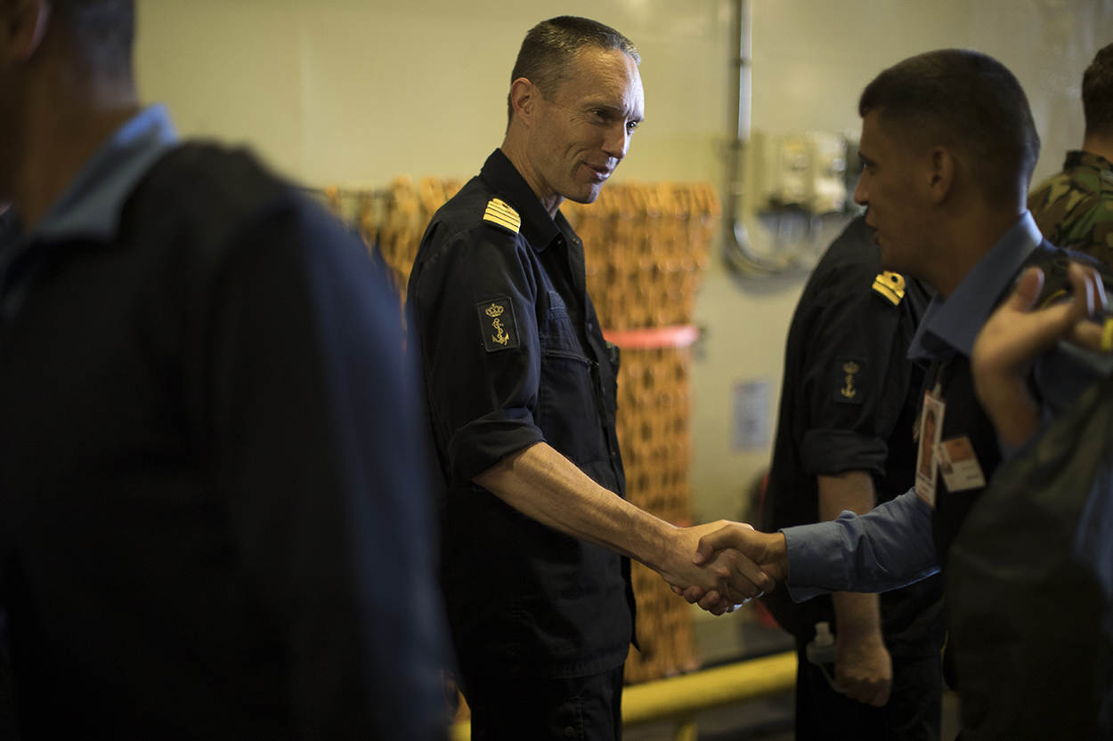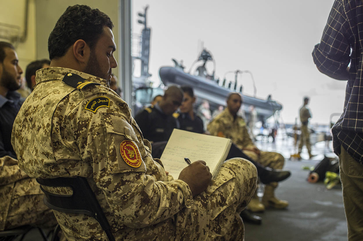Om zo snel mogelijk een goede kustwacht op poten te zetten, stemde het kabinet rap in met een Nederlandse bijdrage aan operatie Sophia. Die bestaat uit de inzet van Zr.Ms. Rotterdam voor 2 maanden op de Middellandse Zee. Hier vormt het amfibisch transportschip het platform voor de opleiding van Libische trainees. Aan boord verzorgt een eenheid van de Britse Royal Marine Commandos met Griekse hulp lessen in boardingoperaties, waaronder doorzoeken en confisqueren. Het onderdeel brandbestrijding komt voor rekening van technisch specialisten van de Duitse marine. Bij dit alles treedt de bemanning van de Rotterdam op als gastheer. Daarin ondersteund door een detachement van het Korps Mariniers, afkomstig van de operationele eenheden uit Texel én Doorn om precies te zijn. Overigens is de Rotterdam niet het enige varende klaslokaal. Ook het Italiaanse amfibisch transportschip San Giorgio doet een duit in het zakje. Aan boord krijgen de trainees onder meer navigatie en mensenrechten bijgebracht.