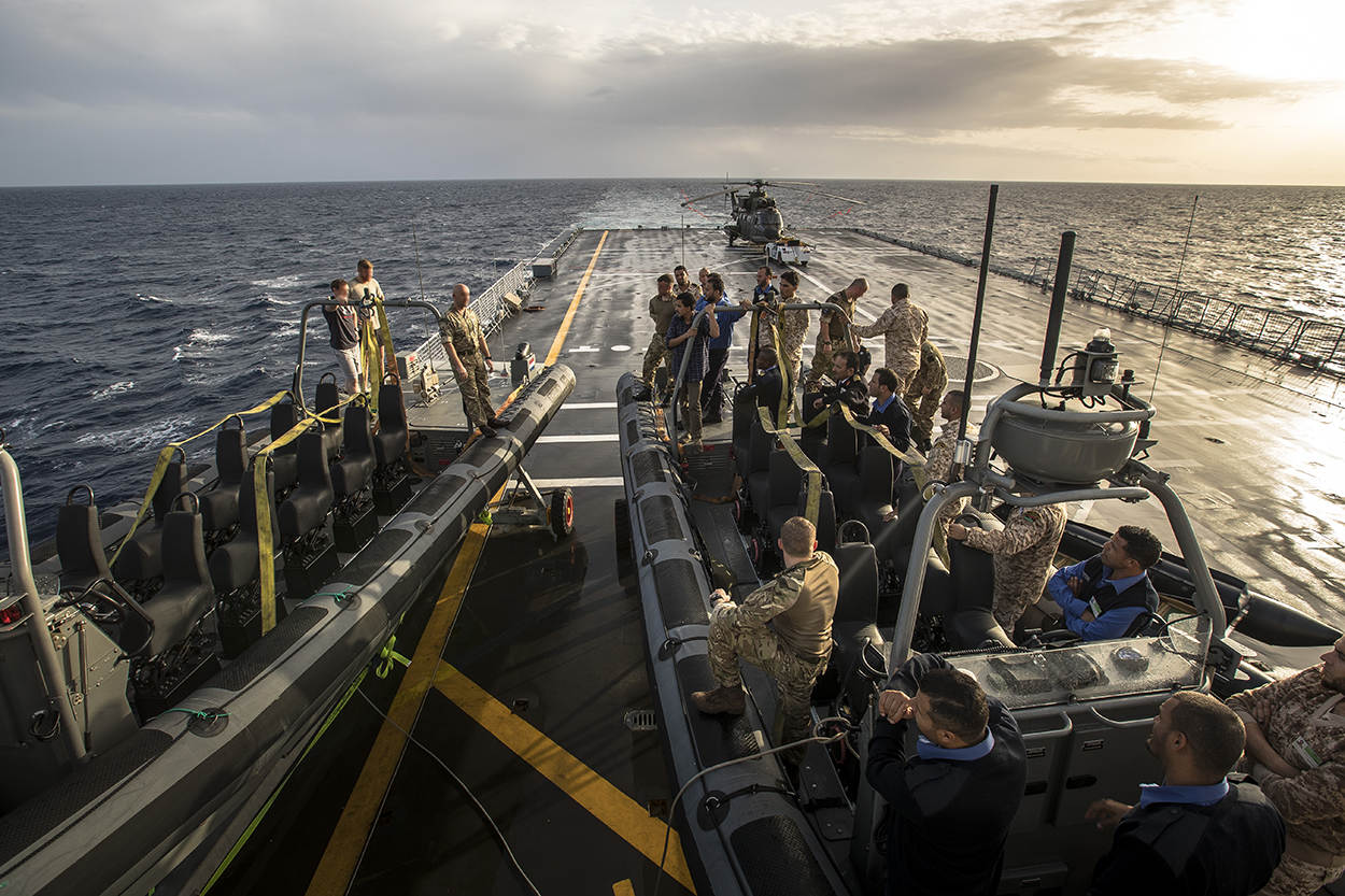 De cursisten maken op het helikopterdek kennis met de zeer snelle rubberboten, waarmee ze de volgende dag gaan werken. Mariniers kijken van een afstandje toe. Zij begeleiden de lessen en waken over de veiligheid aan boord. Ook bieden ze ondersteuning tijdens de trainingen op het water. “In het begin wisten we niet precies hoe we de Libiërs moesten benaderen”, begint eerste luitenant der mariniers Tom. “Ze moeten zich natuurlijk geen gevangene voelen, maar gast en partner. Het is de kunst daarin een goede balans te vinden. Daarvan merkten de trainees niets, want de juiste mindset hadden we al snel gevonden.”