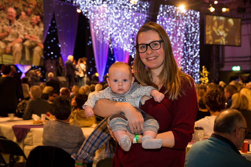 Debbie Ykhout (30) wiegt kleine Finn van 4 maanden heen en weer, terwijl ze kijkt naar het grote scherm op het podium. Haar echtgenoot Edwin kan vanuit Mali ieder moment in beeld komen. “Finn was pas 3 weken oud toen hij wegging, dat vond ik heel heftig. Hij is ons eerste kindje. Edwin krijgt via WhatsApp dagelijks foto’s en filmpjes, zodat hij hem toch ziet groeien. Verder deel ik zoveel mogelijk alledaagse verhalen, zo blijft hij betrokken.” Finn is 1 van de vele kleine kindjes op Missie Max. “Voor het thuisfront is het soms nog zwaarder dan de militair op missie, denk ik. Ik vind veel steun bij mijn 2 schoonzussen, die beiden ook met een militair zijn getrouwd en dus in hetzelfde parket zitten. We eten vaak samen en sleuren elkaar er doorheen.” Als Edwin op het grote scherm verschijnt, valt hij bij het zien van zijn familie even stil. Op aandringen van presentator Jan Slagter brengt hij ‘mooi…, trots…, heel erg trots’ uit. Edwin komt over een paar weken, voor de kerstdagen, weer thuis. “Ik weet gelukkig dat hij het daar goed naar zijn zin heeft. Als hij terug is, weet je weer wat je mist aan elkaar. Dan besef je weer hoe goed je het samen hebt. Als mijn man weet dat het met ons ons goed gaat, heeft hij het ook makkelijker. Dat is de kracht van vrouwen van militairen, ze kunnen zelfstandig en soms alleen zijn.”