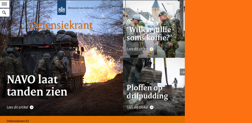 Op zoek naar een artikel uit een digitaal defensieblad, maar u weet niet meer in welke editie het heeft gestaan? Geen nood. Sinds deze uitgave van de Defensiekrant is een zoekfunctie toegevoegd, die uitkomst biedt. In de kiosk van ieder defensieblad is het invulveld te gebruiken. Eenmaal in een magazine kunt u de zoekoptie gebruiken door op de button onder het zogenoemde hamburgermenu in de linkerbovenhoek te klikken en uw zoektermen invoeren. De nieuw toegevoegde zoekfunctie is alleen van toepassing op de digitale magazines van Defensie. Het digitale archief van de Defensiekrant, KMarMagazine, Landmacht, Alle Hens, de Vliegende Hollander en Materieelgezien gaat terug tot en met februari 2014.
