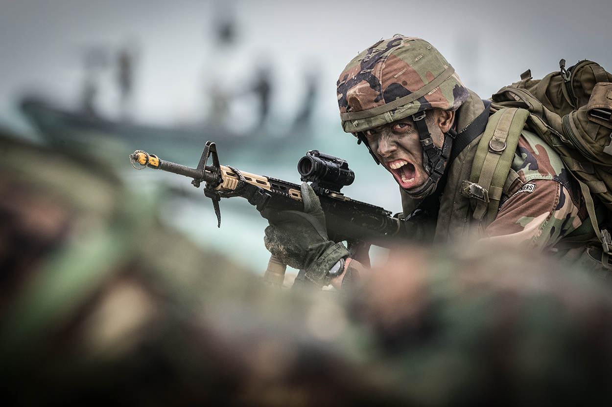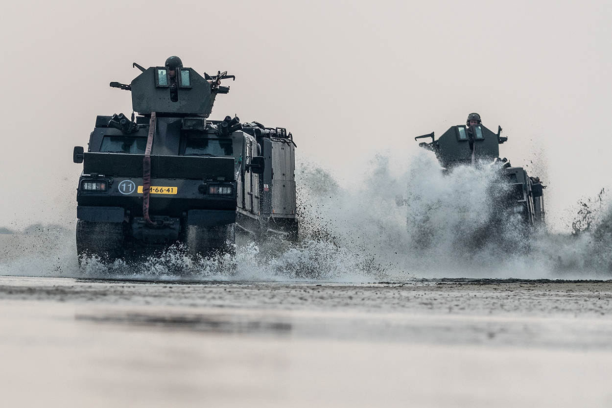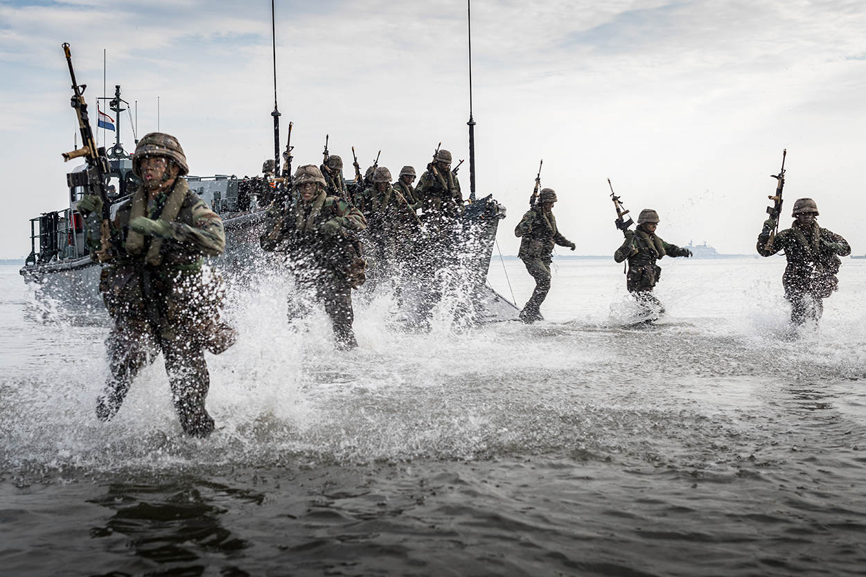 Rustig ligt Zr. Ms. Rotterdam in een strakke Waddenzee als uit de buik van het grootste schip van de marine 2 LCVP’s tevoorschijn komen. 4 FRISC-motorboten zorgen voor vuursteun als de kleppen van de landingsvaartuigen langzaam opengaan. Ruim 50 mariniers in opleiding springen eruit, banjeren door het water en vallen plat op het strand. Wapen vooruit. Blik gefocust op de duinen.
