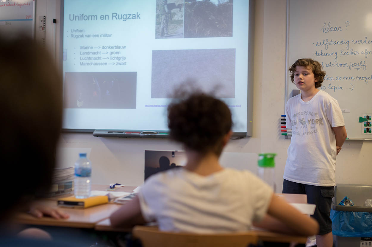 Luca beperkt zich ook niet alleen tot de informatie uit het pakket. “De hoogste onderscheiding is de Militaire Willems-Orde”, vertelt Luca zijn klas. “Die heeft Marco Kroon gekregen en hem heb ik een keer ontmoet”, voegt hij vol trots toe.