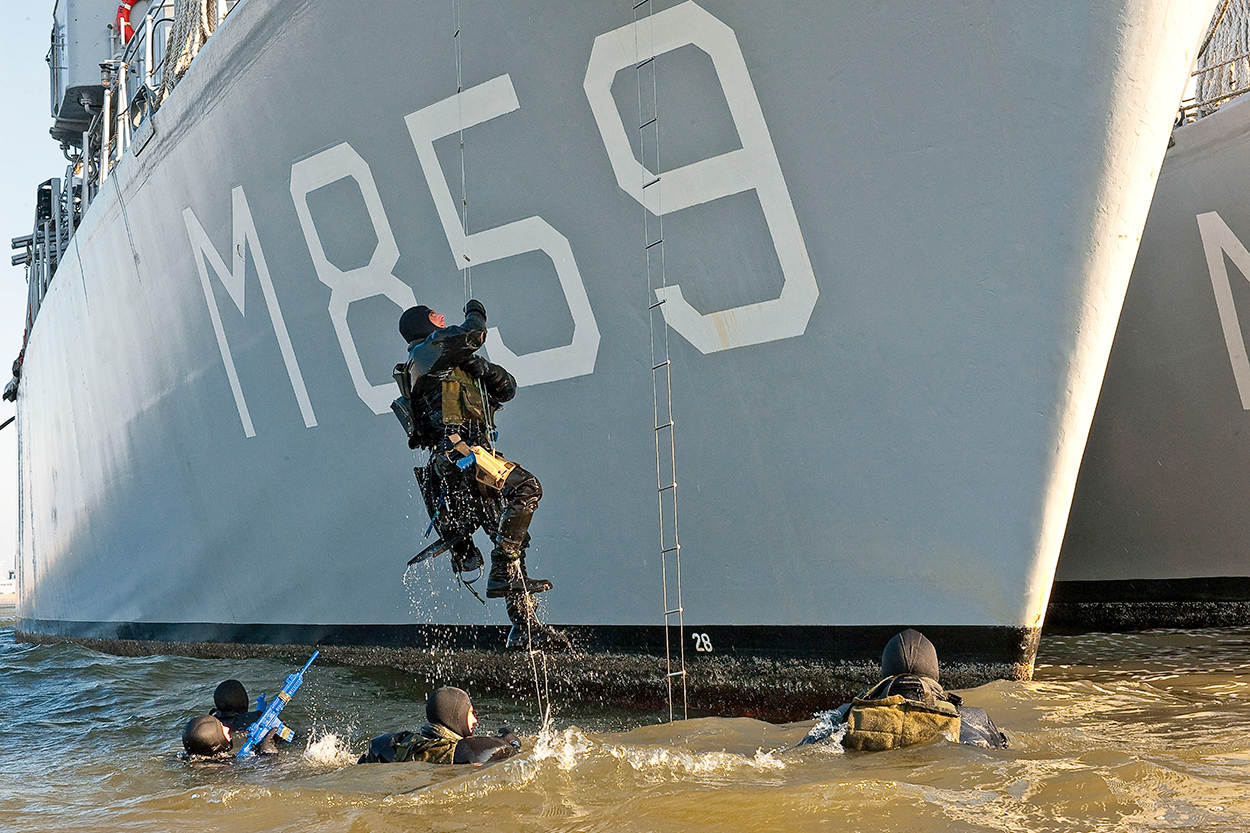 Zo pleit hij voor meer deelname aan de continuation training (CT). “Die was een tijdje verdrongen door de pre-deployment training. Een belangrijk opwerktraject voor specifieke missies. De CT moeten we echter weer gaan uitvoeren, bovenop de andere trainingen. Daar zijn we in beperkte mate al mee begonnen. Zo zijn Zr. Ms. De Ruyter en Tromp na de grote NAVO-oefening Joint Warrior, vorige maand bij Schotland, nog een aantal dagen onder handen genomen door de Flag Officer Sea Training in Plymouth. Zeg maar voor de puntjes op de i. De skills & drills in het hoge deel van het geweldspectrum opfrissen.”