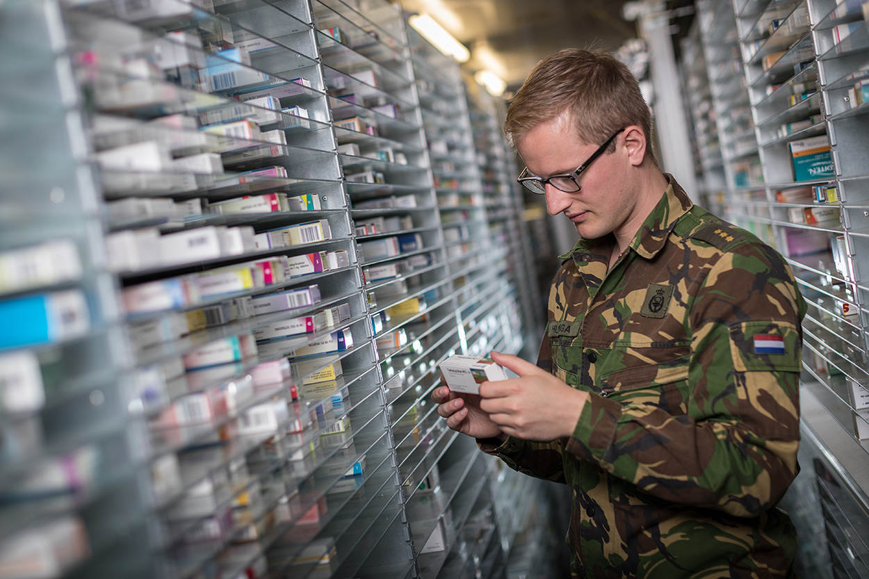Op zijn reguliere werkplek, op de Kromhoutkazerne, wisselt hij de functie ‘apotheker van de dag’ af met collega’s. “Vanuit gezondheidscentra op kazernes, oefeningen en missiegebieden komen verschillende soorten vragen bij ons binnen. Dat kunnen complexe vragen zijn waar ik flink wat onderzoek voor moet doen, maar het kan ook zijn dat er wordt gevraagd hoeveel paracetamol je dagelijks mag gebruiken.”