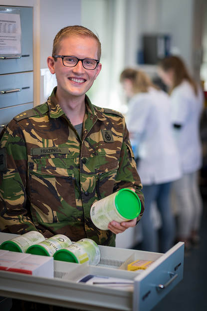 Al snel werd de twintiger aangenomen en in februari vorig jaar begon hij aan de verkorte officiersopleiding aan de Koninklijke Militaire Academie (KMA) in Breda. Binnen Defensie kun je als apotheker doorgroeien in een senior rol en uiteindelijk naar commandant. Ook zijn er apothekers die zijn gespecialiseerd in kwaliteitscontrole. Zij houden zich onder meer bezig met de aanschaf van geneesmiddelen.