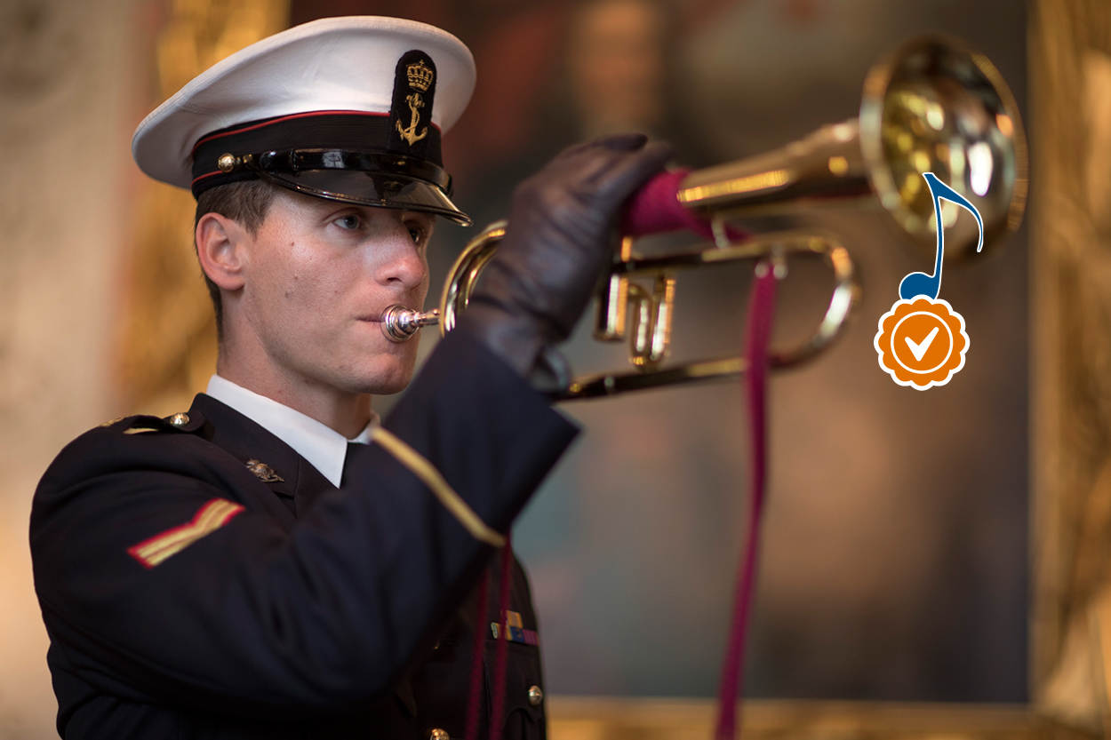 Met beleid trekt hij z’n handschoenen aan, hangt z’n signaalhoorn recht op z’n rug, veegt wat pluisjes van z’n jasje en zet met precisie zijn pet op z´n hoofd. “Zo, ik wil dat alles er piekfijn uitziet bij een optreden”, zegt de 29-jarige korporaal-tamboer Werner van de Velde.