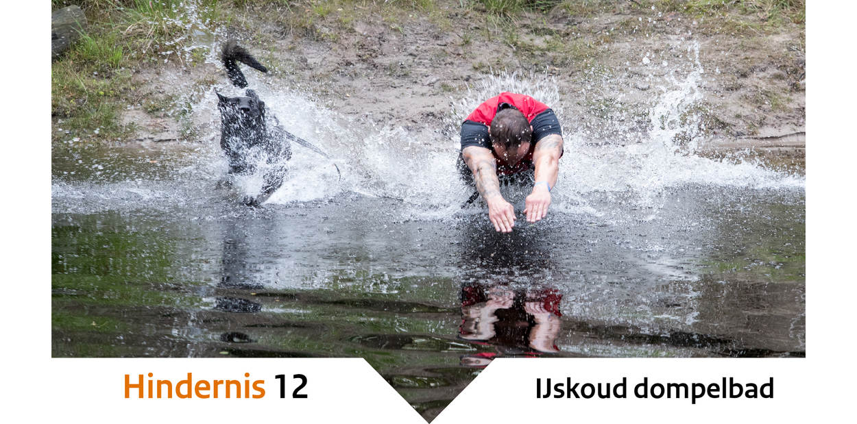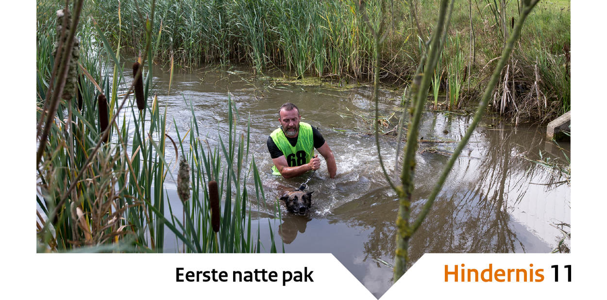Hijgend komt team 69 uit het water bij hindernis 11. “Nu begint de ellende pas”, klinkt het gekscherend. Nog 13 obstakels te gaan; het was afzien tijdens de Hondenbiatlon op vliegbasis Woensdrecht.