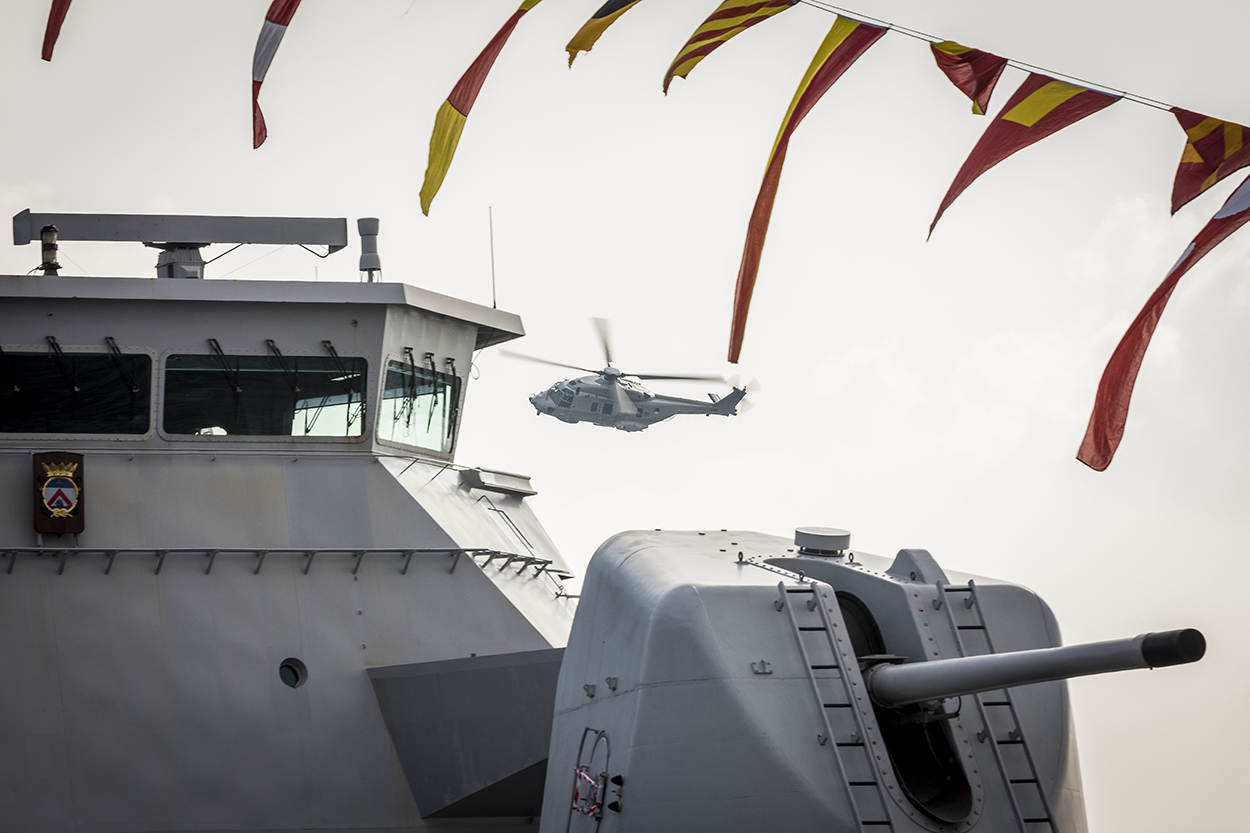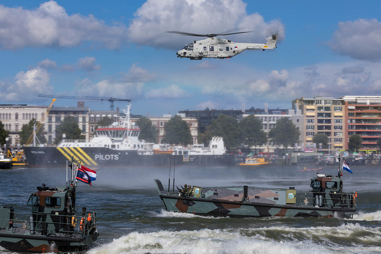 Zelden zie je ze zo laag; de NH90 maritieme helikopter van Defensie. Op de Wereldhavendagen vliegen ze af en aan. De vliegers ondersteunen mariniers, die een bevrijdingsactie van een gekaapt schip demonstreren. Ook laten ze zien hoe ze drugssmokkelaars onderscheppen in het Caraïbisch gebied.