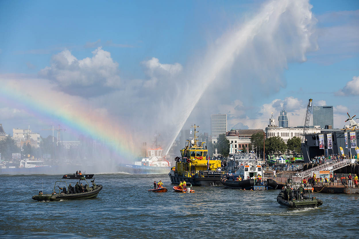 Niet alleen de marine, maar ook de Dordtse Reddingsbrigade, sleepboten, baggeraars en het Havenbedrijf Rotterdam laten spectaculaire demonstraties zien op de Nieuwe Maas.