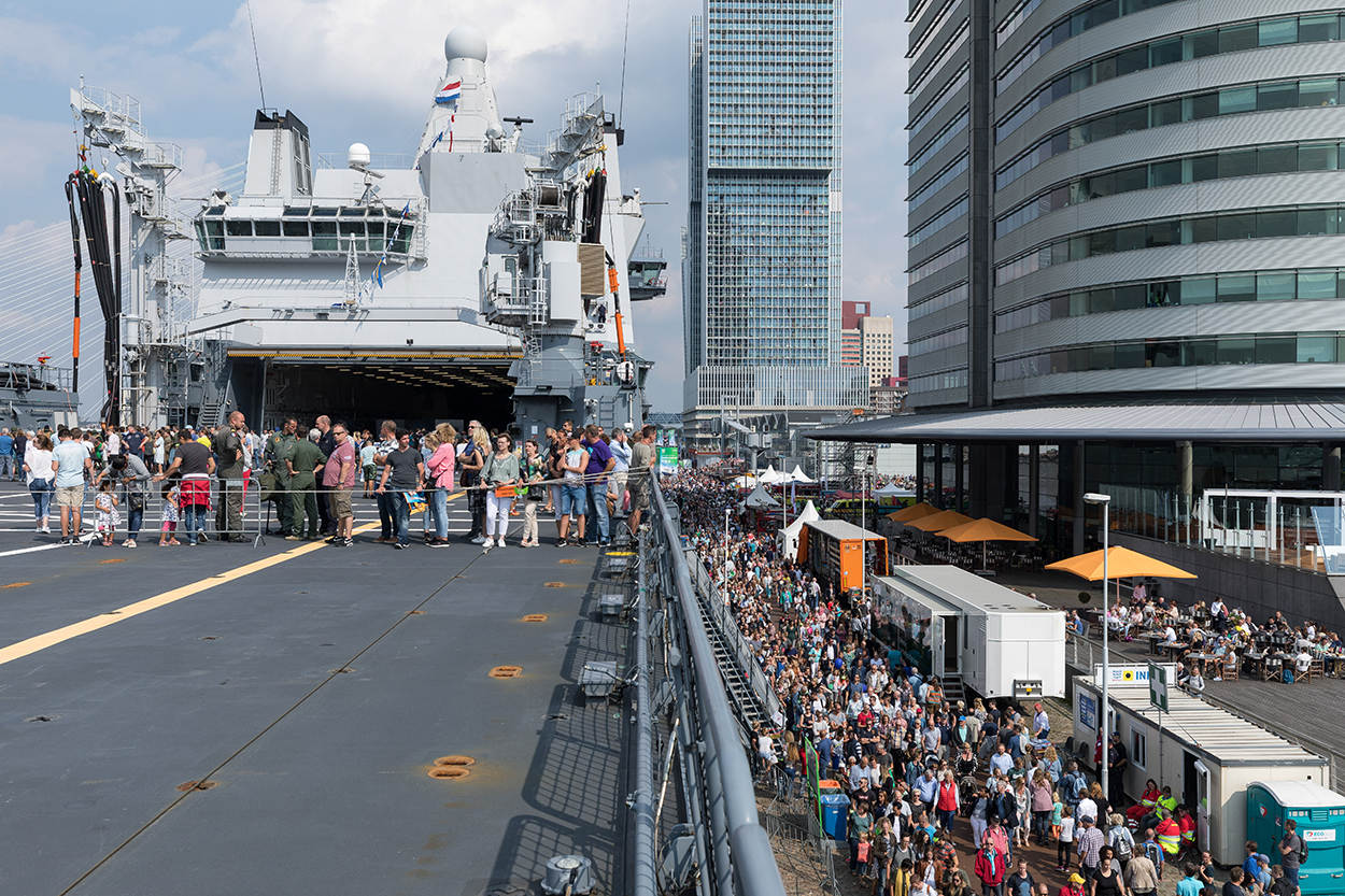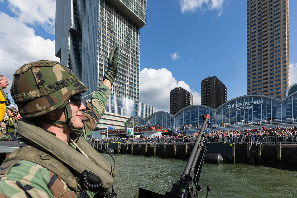Een marinier zwaait naar het massaal toegestroomde publiek voor de Rotterdam Cruise Terminal.